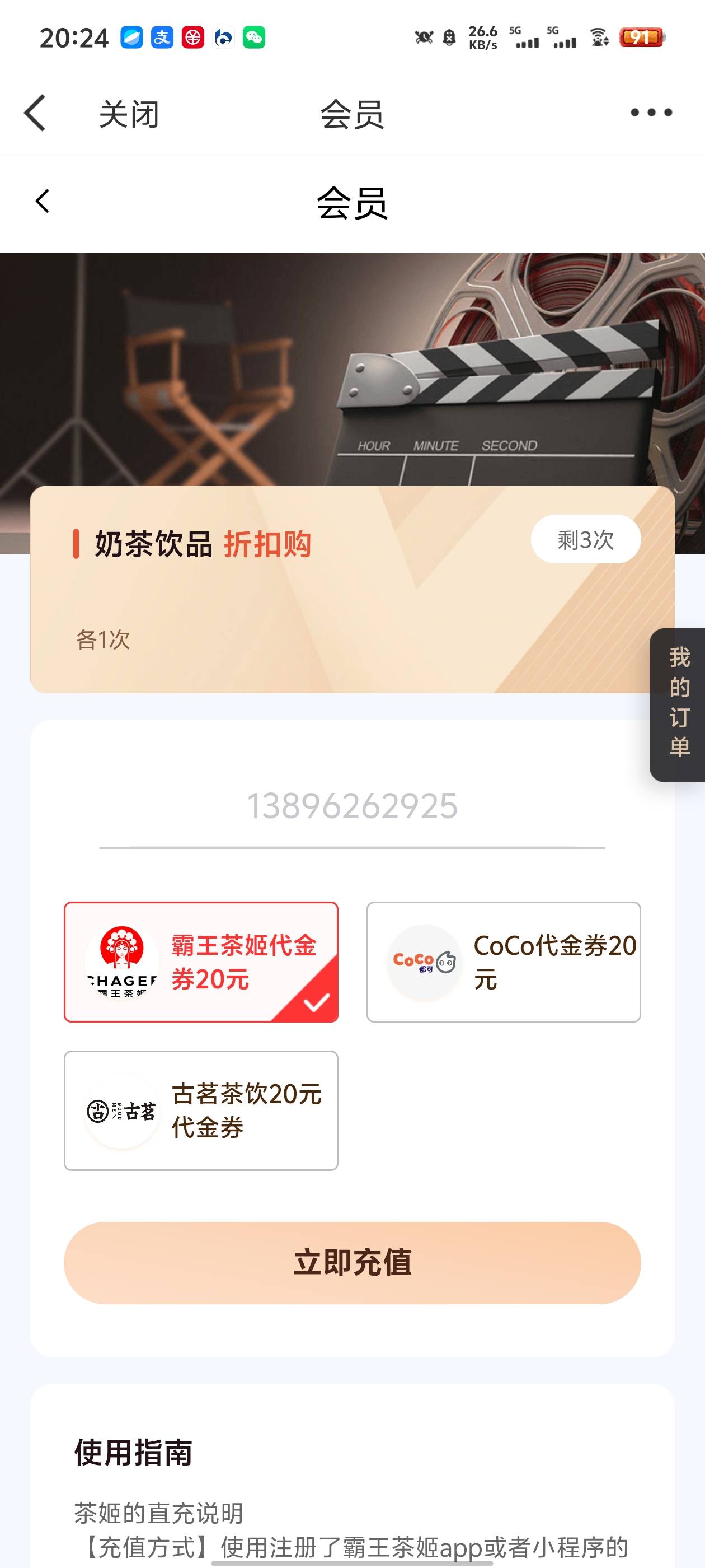 返回去。点立即领取,再选择霸王茶姬。你从外面直接点霸王茶姬就一直是原来的手机号