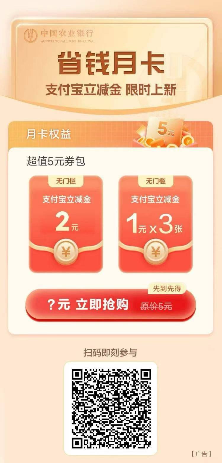 农行省钱月卡支付宝立减金限时优惠购活动
