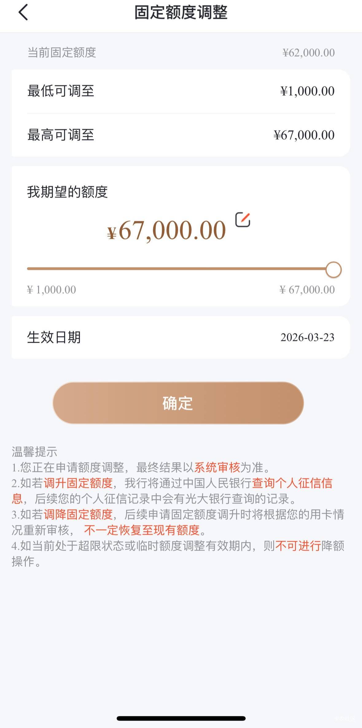 光大银行提升额度了,间隔3+1,上次4.9-6.2,这次6.2-6.7,有史以来最低幅度。