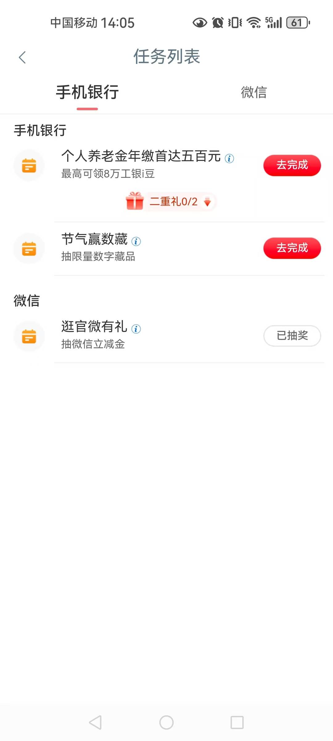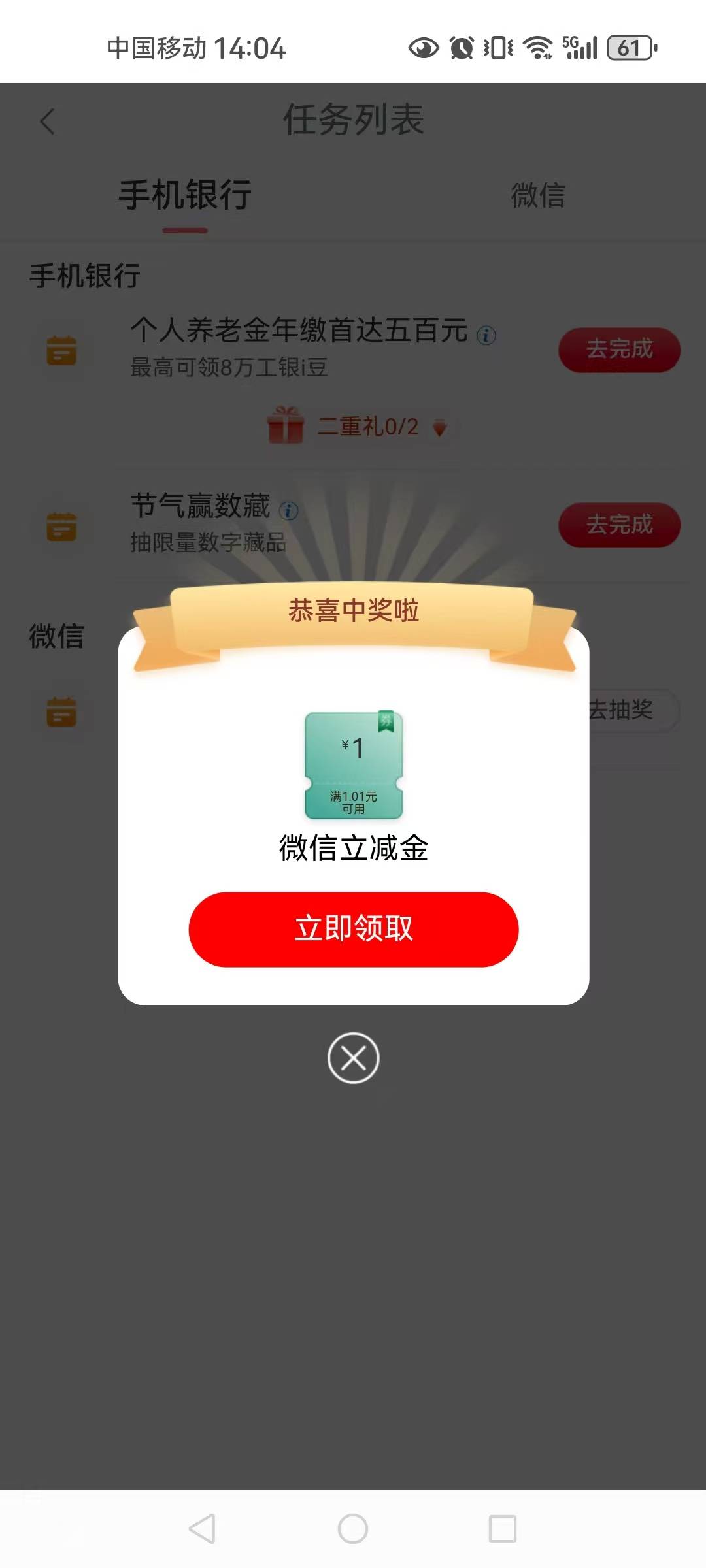 工行任务中心逛官微有礼抽微信立减金活动
