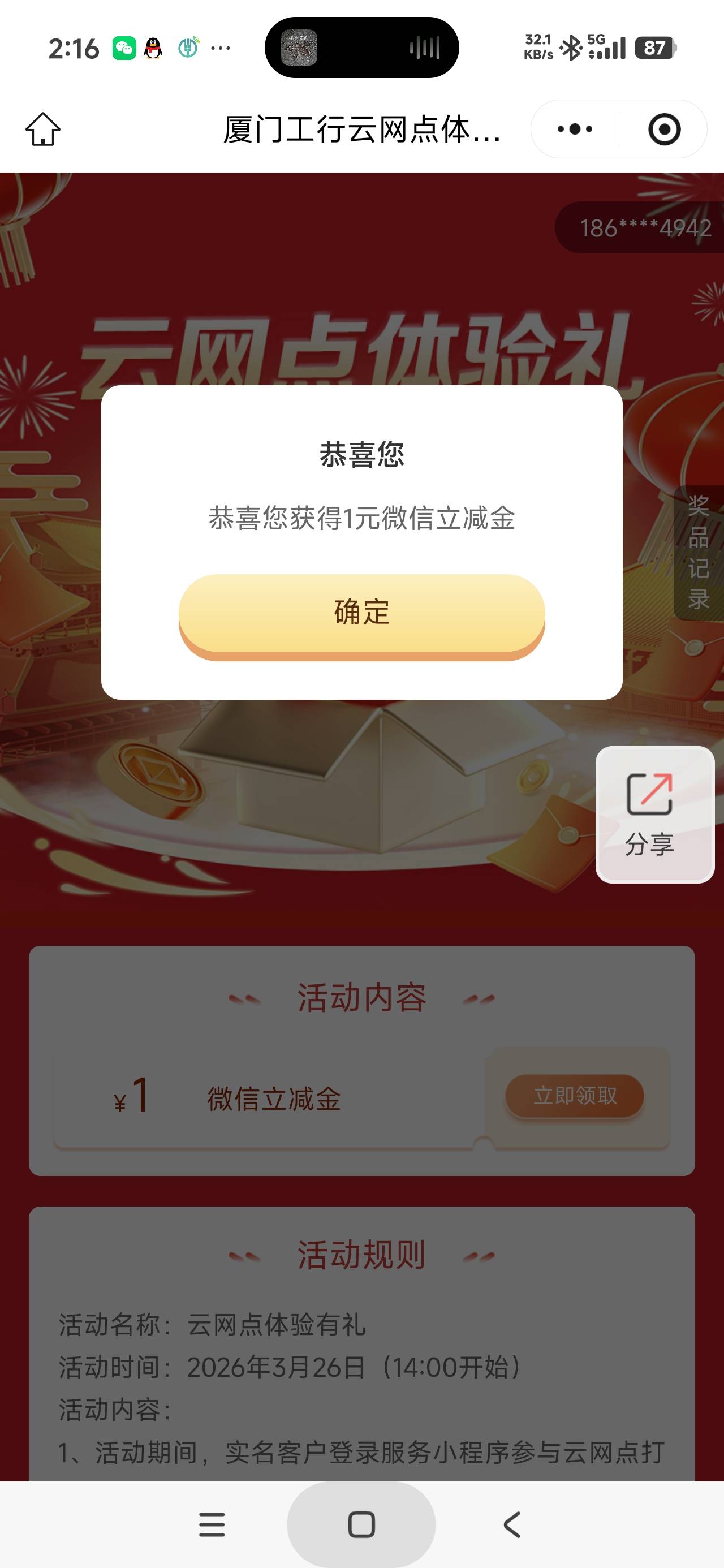 工行服务小程序厦门云网点体验礼活动