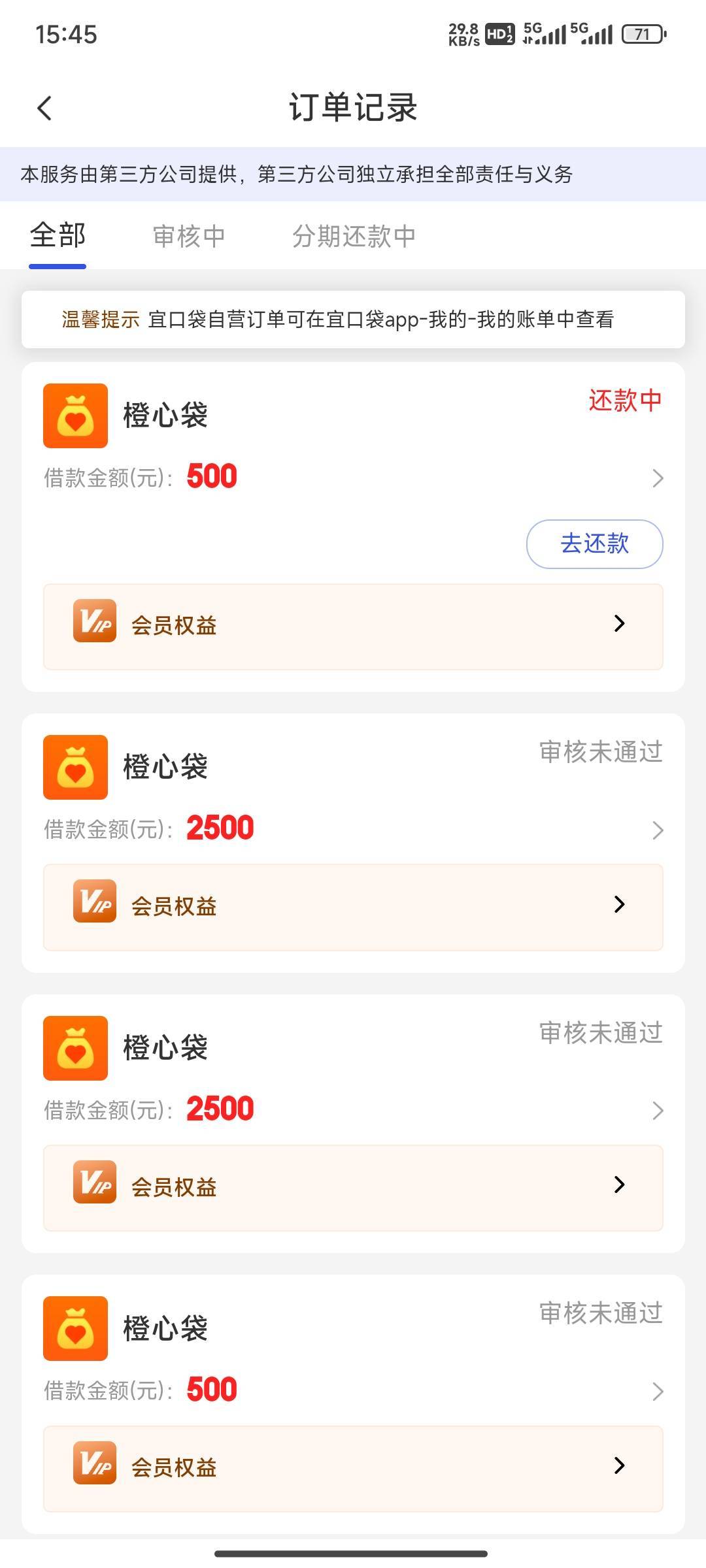 宜口袋里昨天申请的橙心贷,今天到了今天还款日,第一次下五百是宜口袋本体