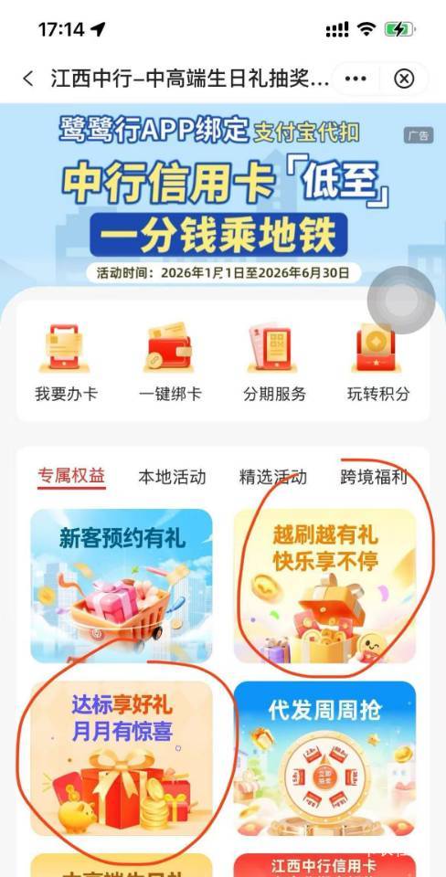 有中行信用卡江西的可以去看看这个,生活-本地专属-信用卡专区-达标享好礼月月有惊喜,越刷越有礼也记得报一下名也有抽奖