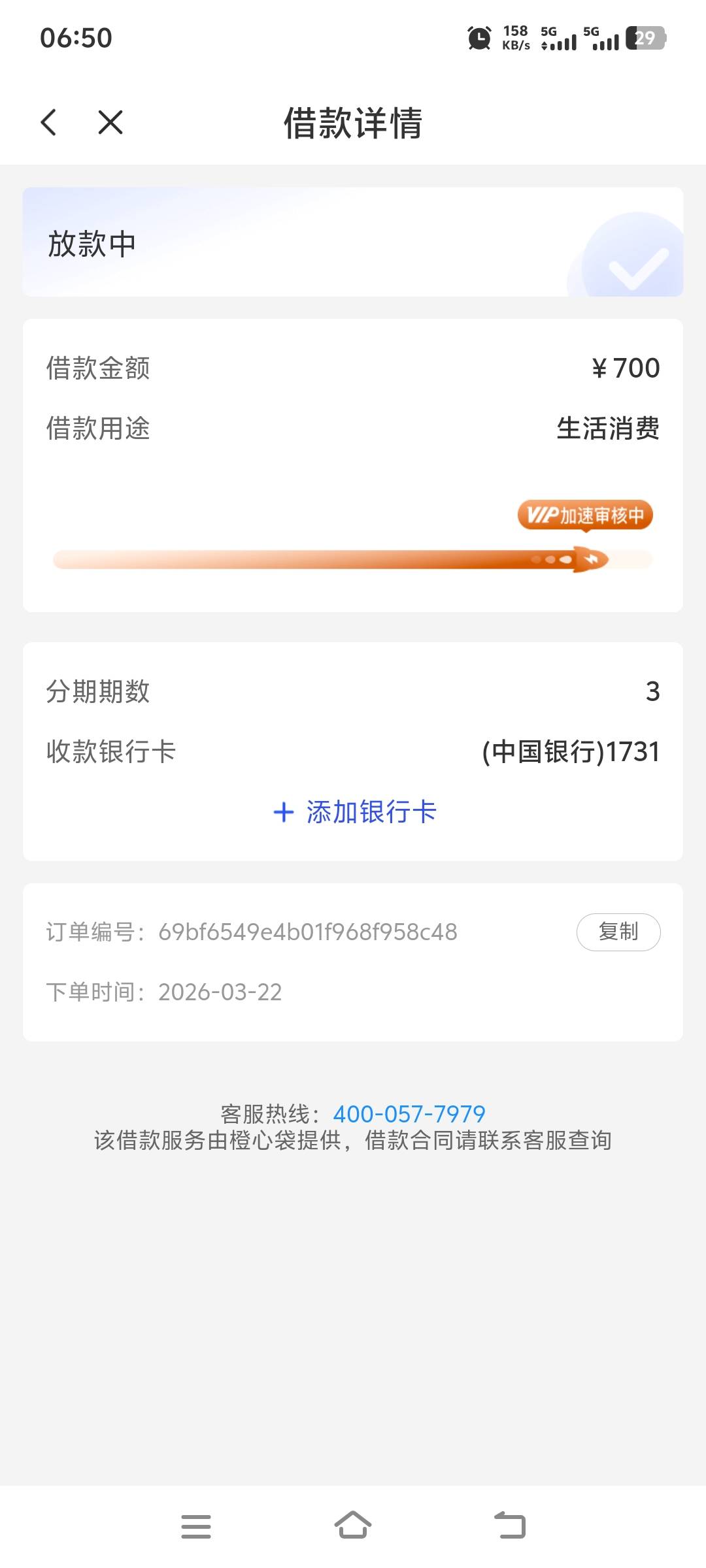 咱俩一模一样  我也是700额度  25号还款日  22号申请的   现在还没下   你开会员了吗