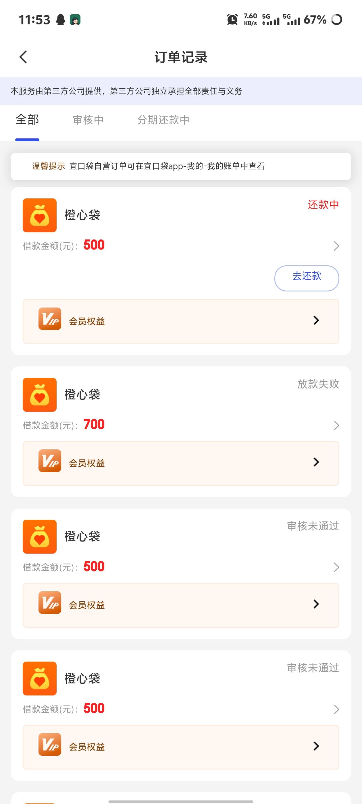cxd第三次500终于下了,19号申请的一个星期后放款失败,22还款日逾期了,后面发短信加的客服给协调,我都不抱太大希望了,没想到后半夜偷偷放款秒扣,不过会员没扣到。