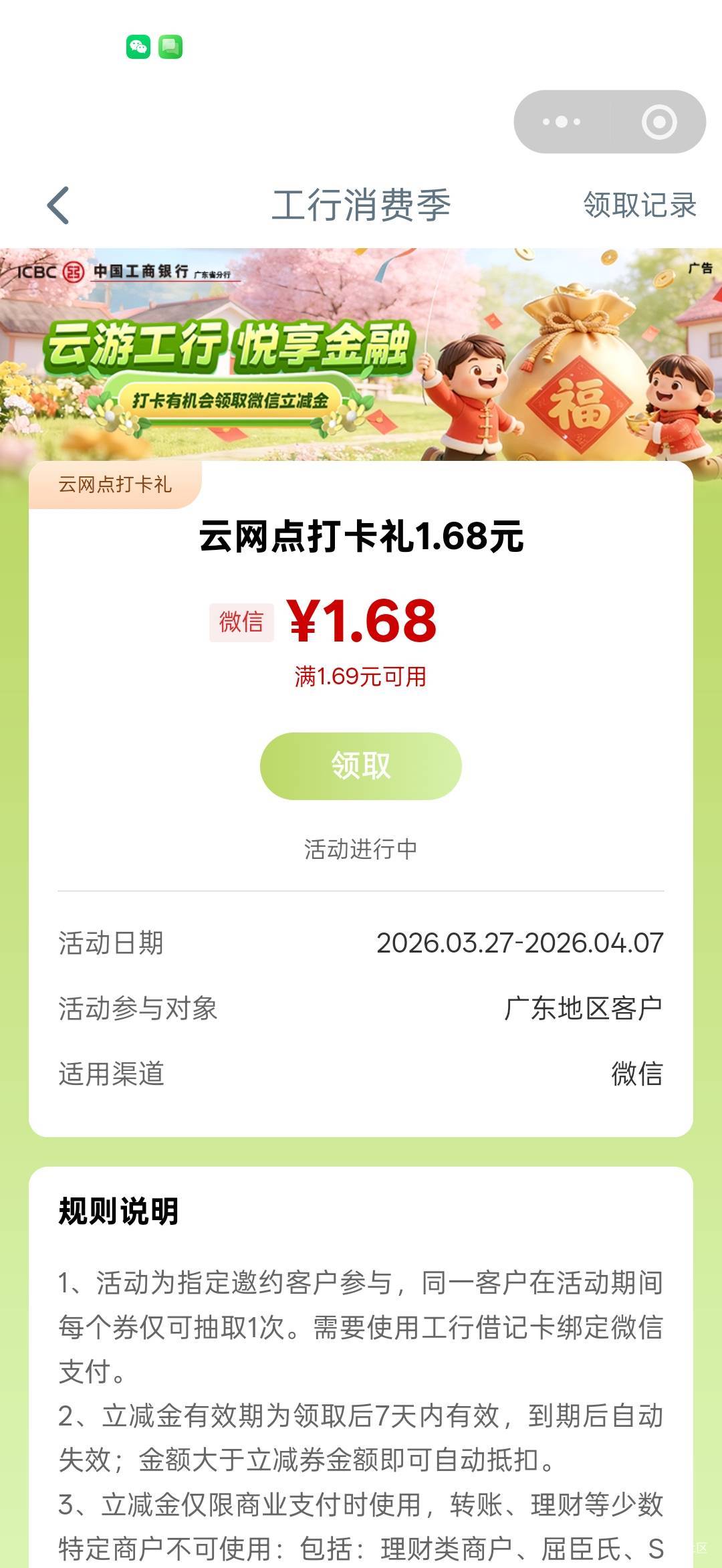 工行服务小程序广东云网点打卡礼活动