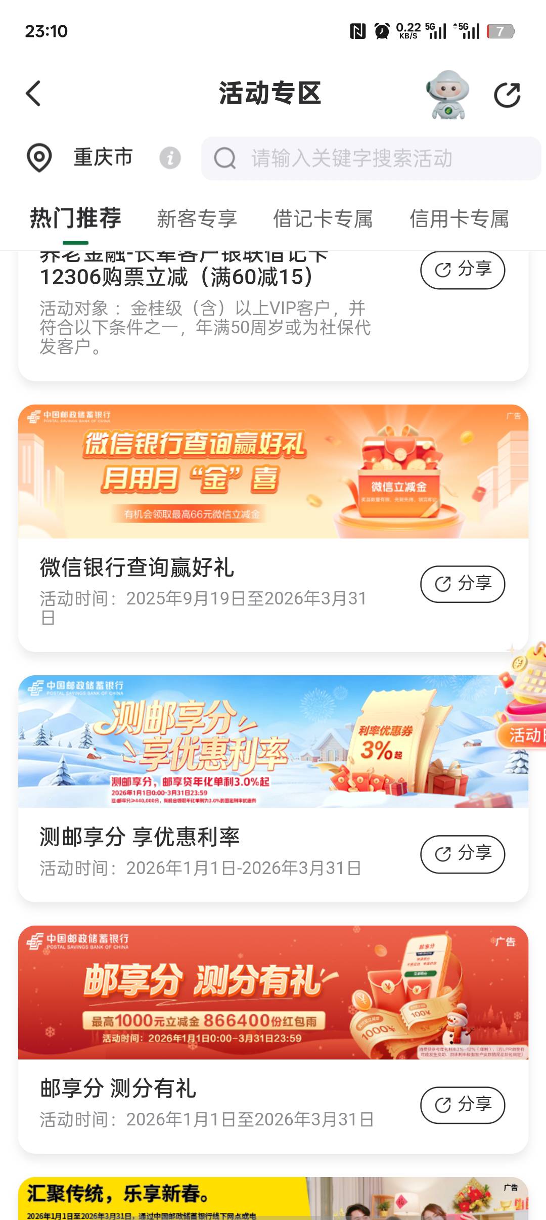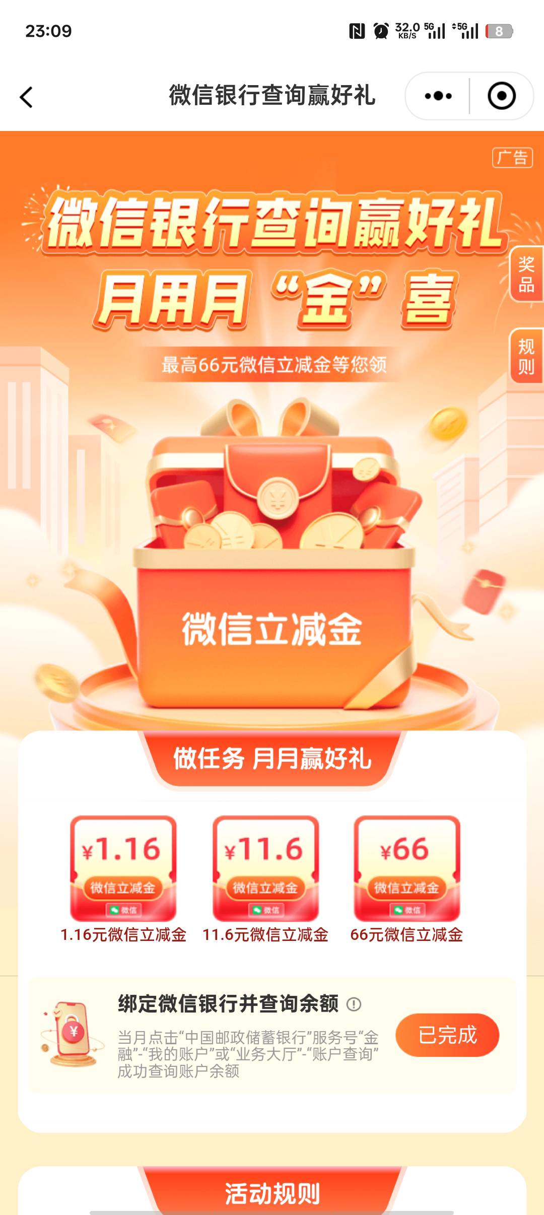邮政储蓄银行APP  任务中心  微信银行查询有礼