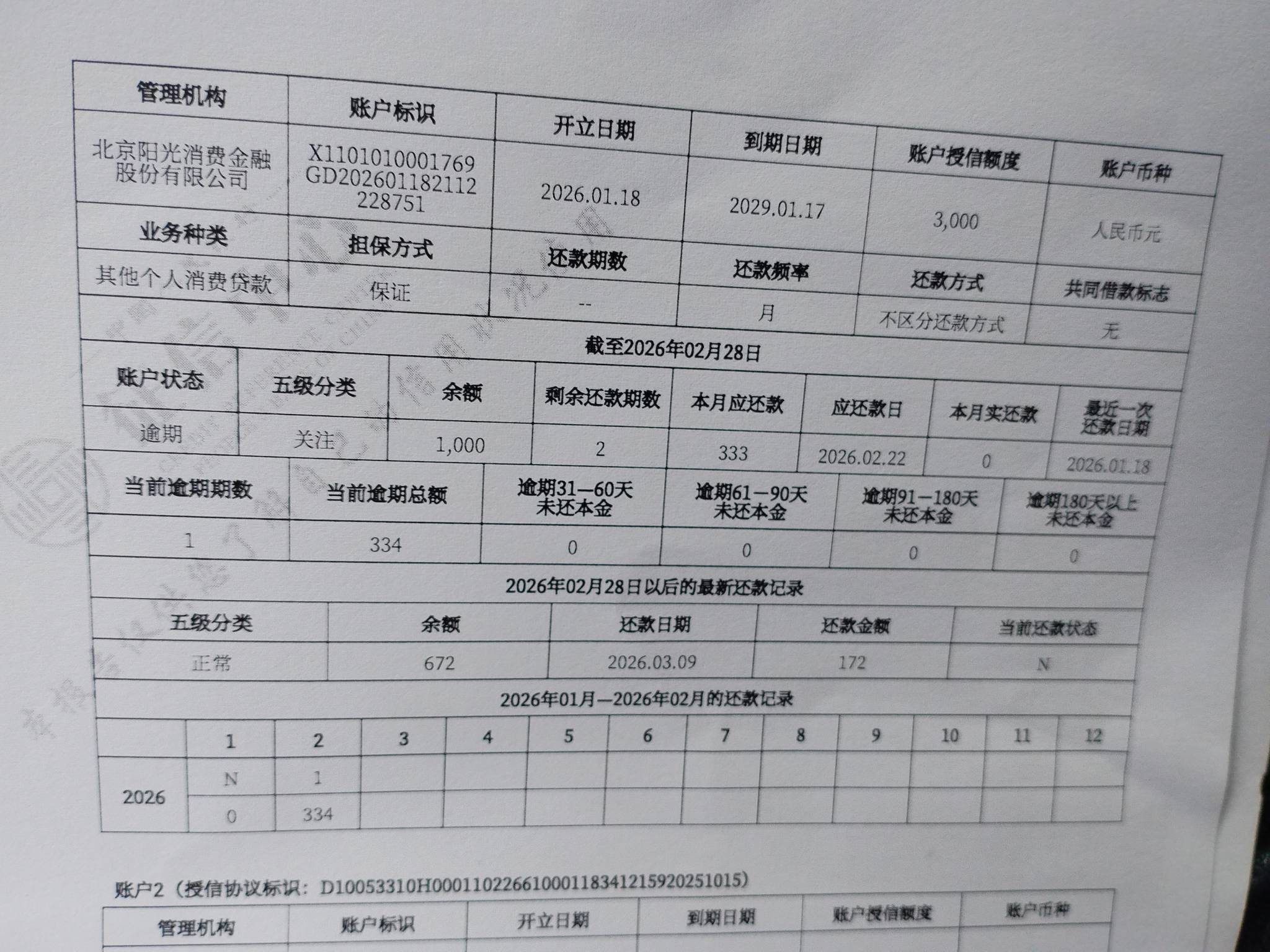 你一份月申请的3000,二月份逾期了