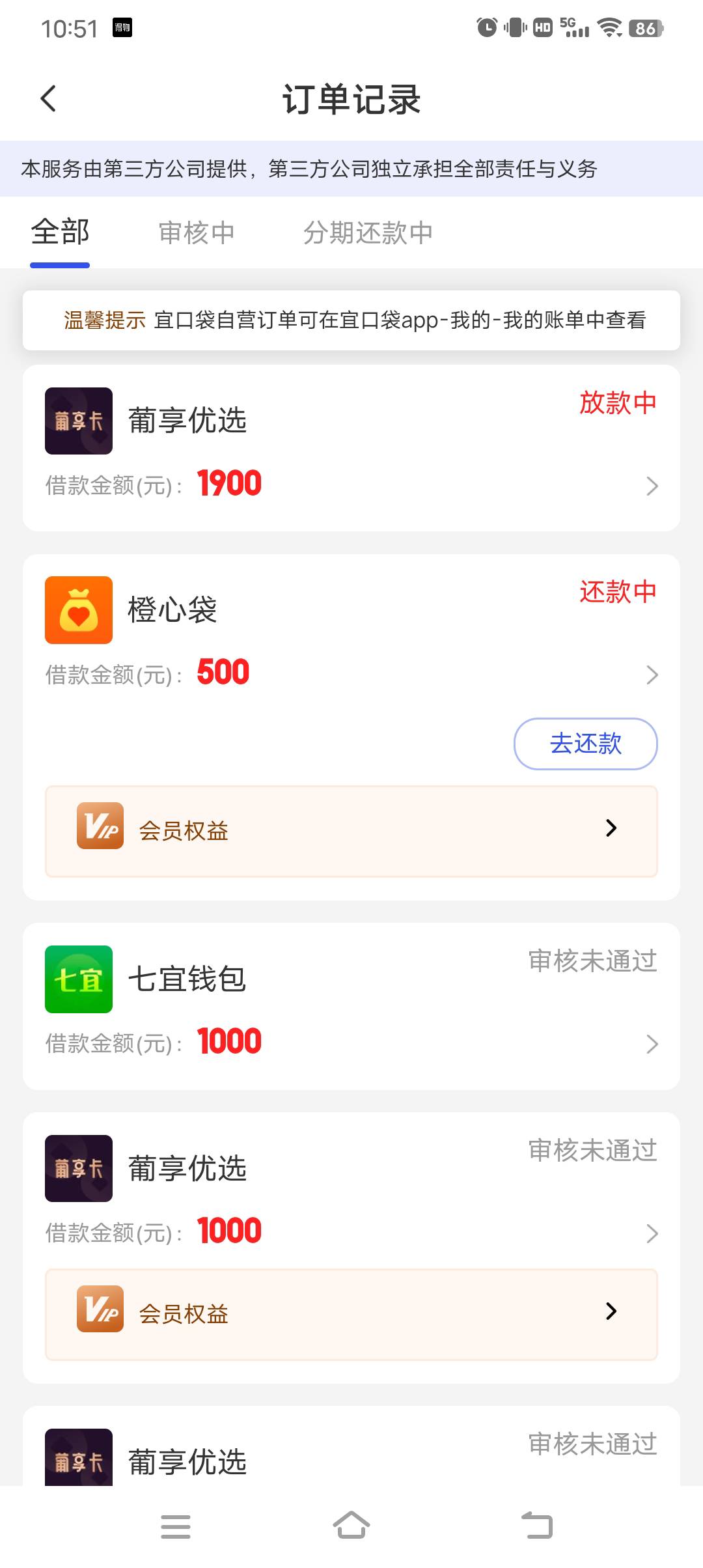 橙心袋放款6天,没交会员,之前退过会员,早上五点多到账,然后pxyx1000不给给1900现