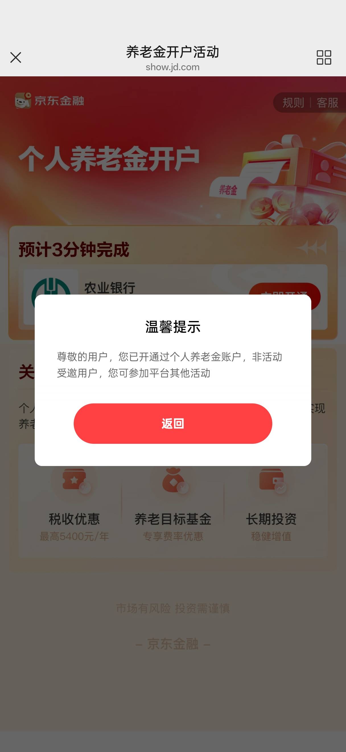 老哥们,农行京东个人养老金,可以做两个。今天换了个平台换了个京东号拿下了,通过了