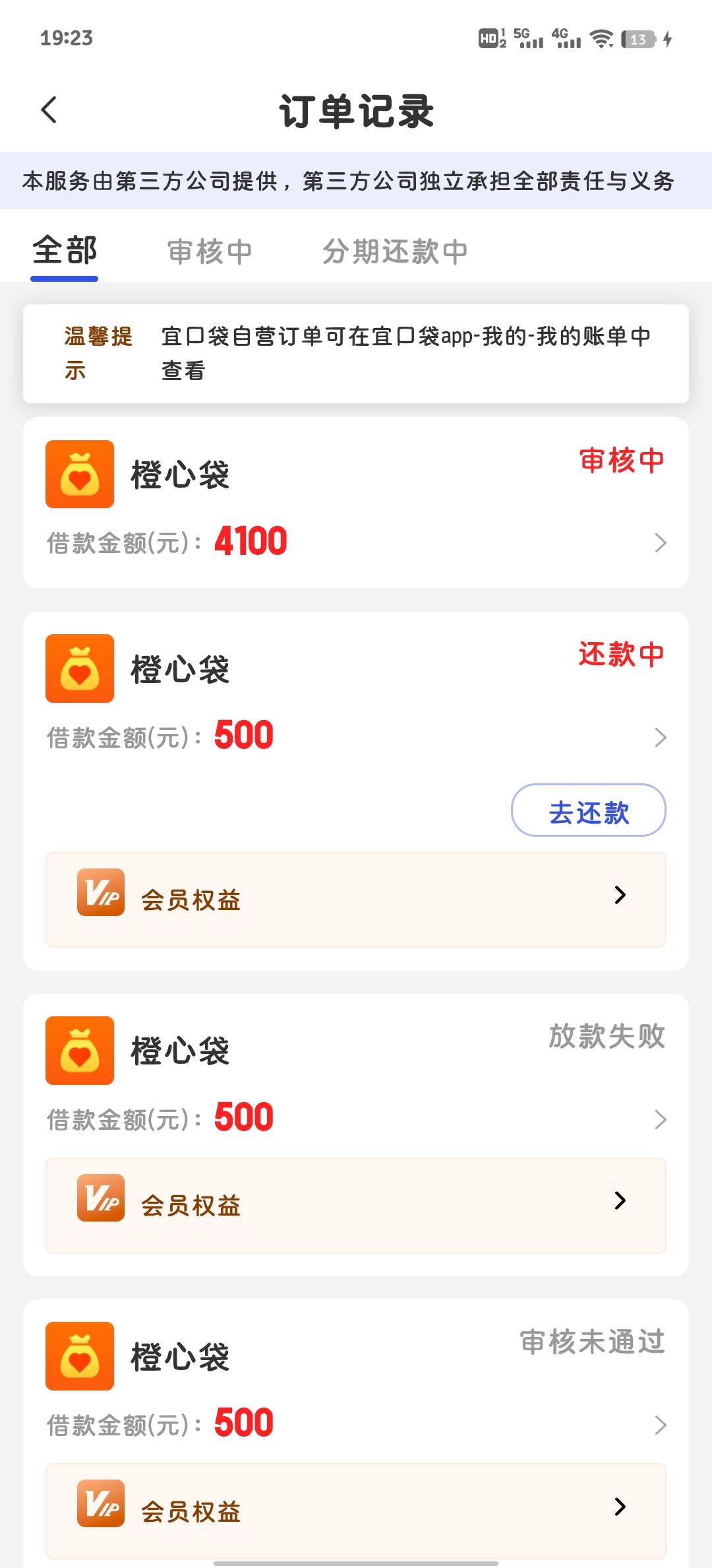 审核中应该是挂了 直接去橙心袋那里就能看状态 挂了橙心袋app会显示 宜口袋有延迟