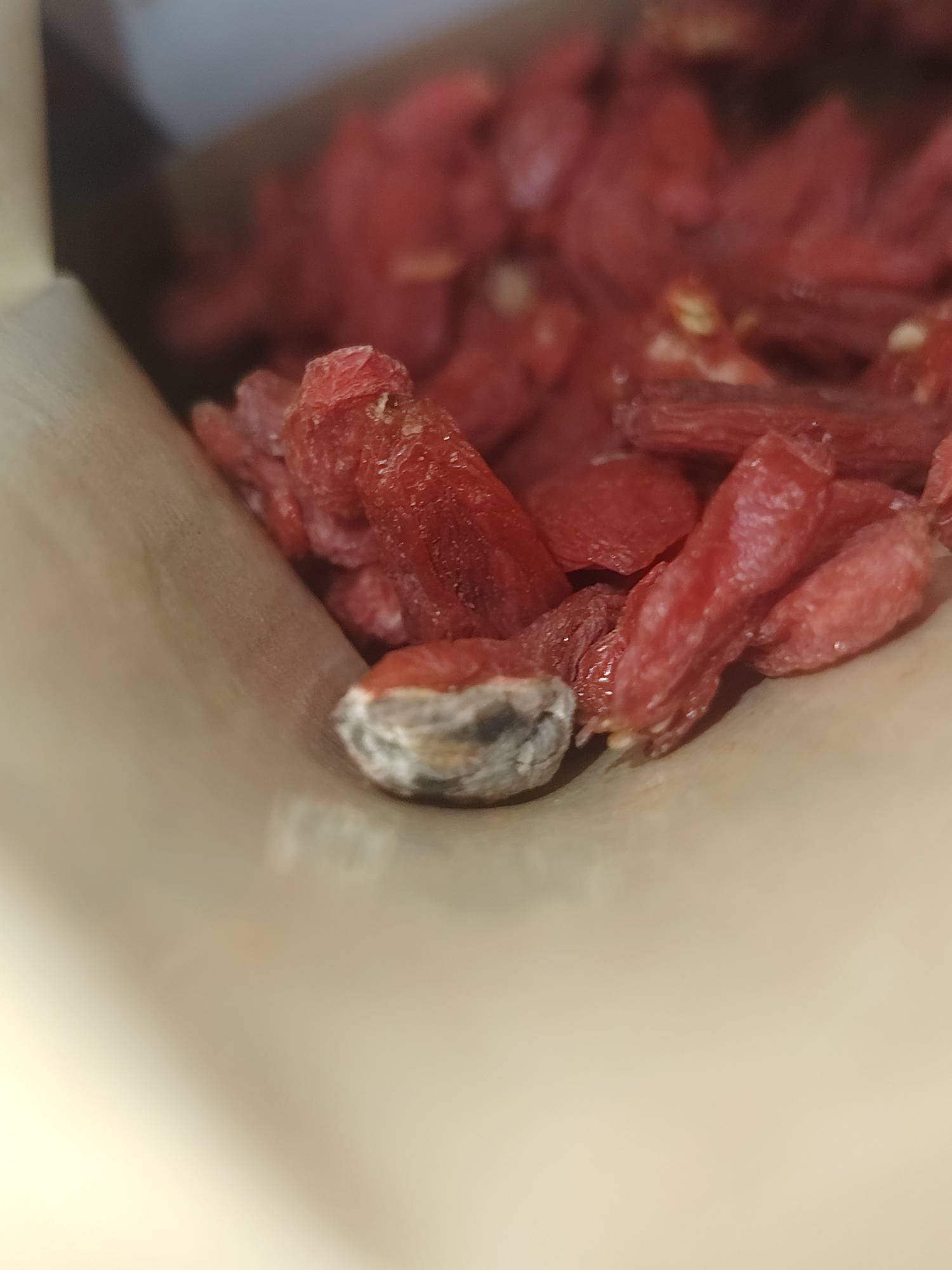 老哥们 京东自营买的枸杞,今晚快递刚到 居然发霉 晚上泡了一壶喝了一半 后面