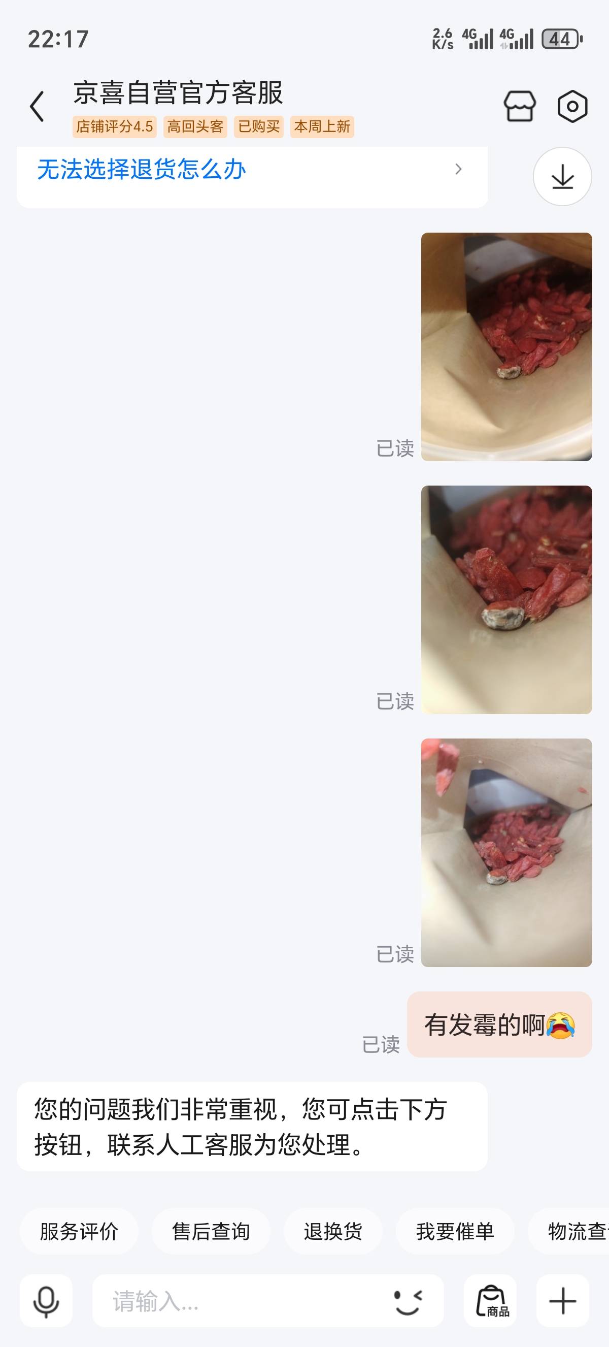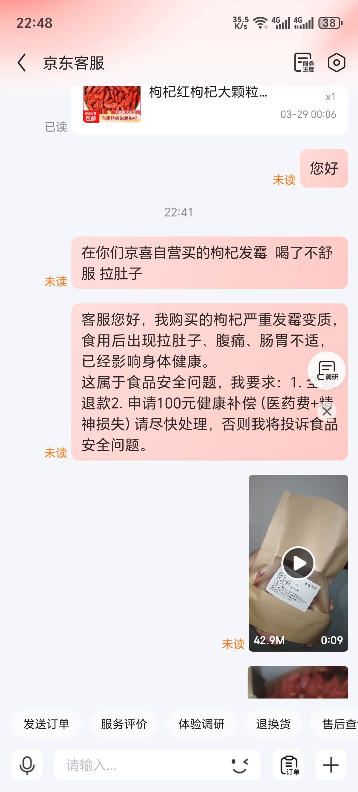 老哥们   京东自营买的枸杞,今晚快递刚到   居然发霉   晚上泡了一壶喝了一半  后面就拉肚子了  可以申请10块钱么
