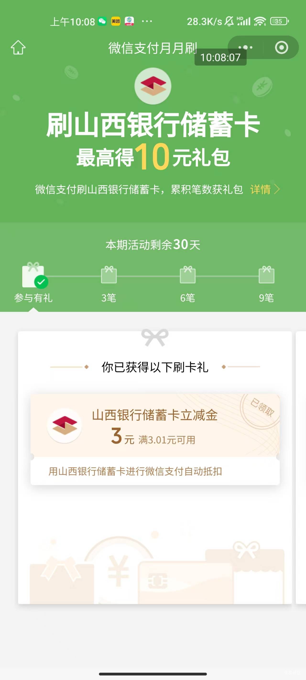 山西银行微信支付月月刷活动
