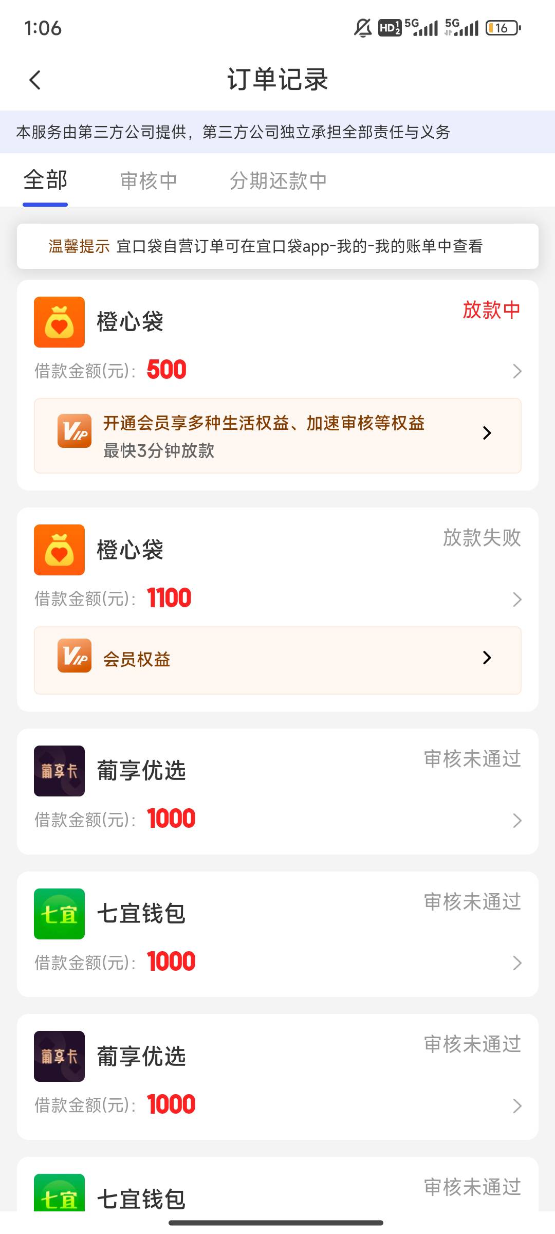 3号诚信贷还款日,昨天出的额度,今天开的先用后付并支付了会员,6号宜口袋本体还款日,我的如果七天放款就没有必要申请了,我一分也得不到