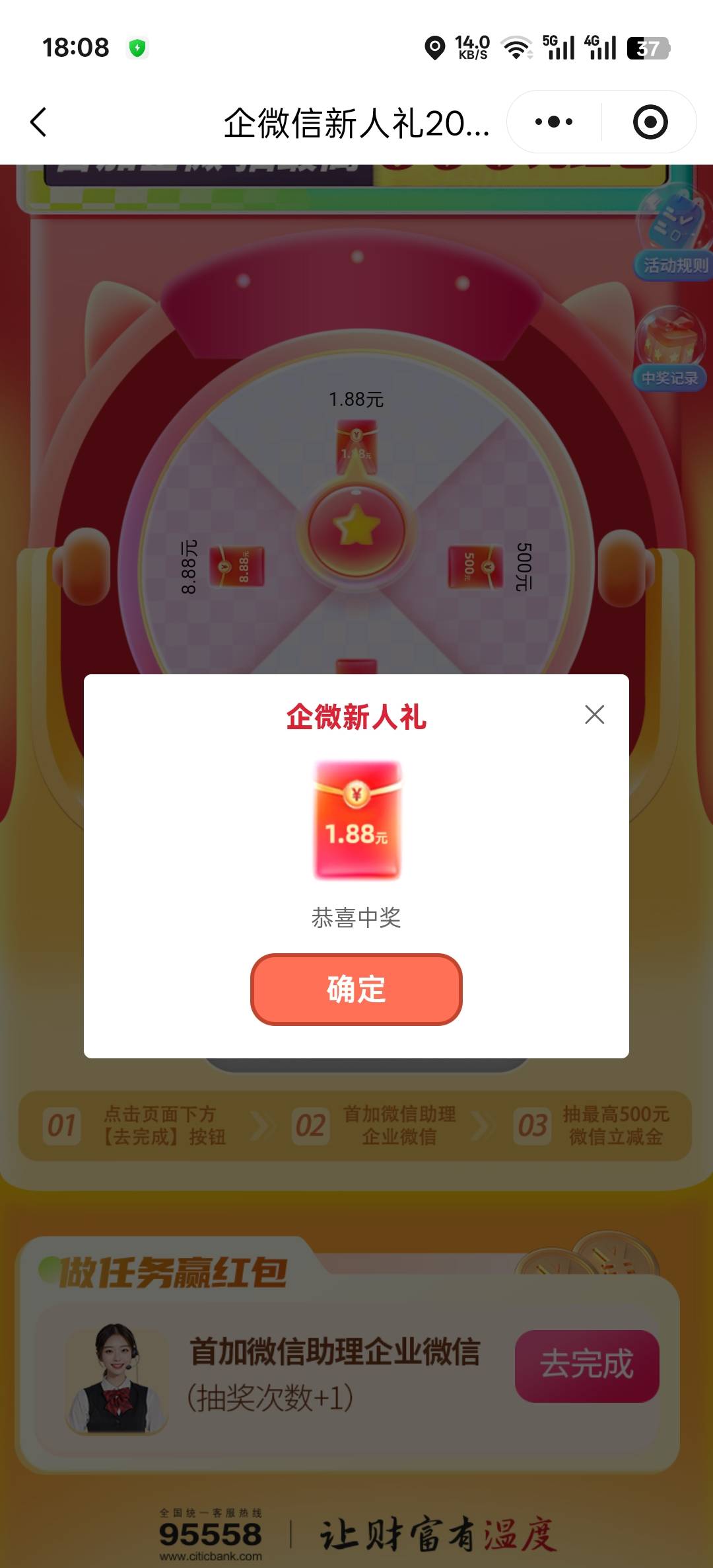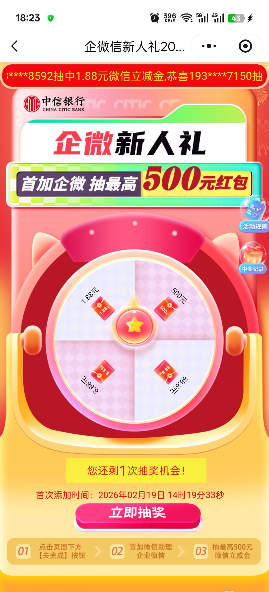 中信银行不用加企微也能抽一次,保底1.88,3v吃上了