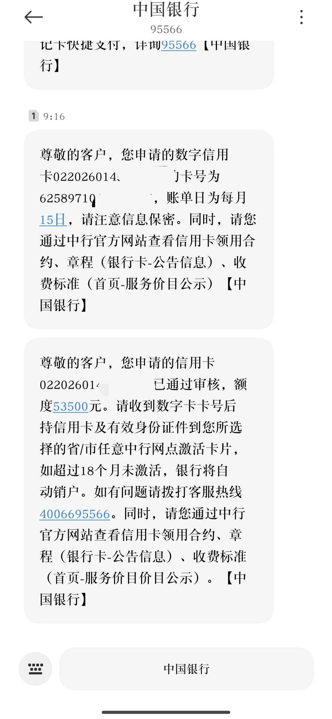 中行额度始终1.2w,去年2月底销卡,今天重申数字卡,提交成功2分钟后收到审核短信,5.35w额度。