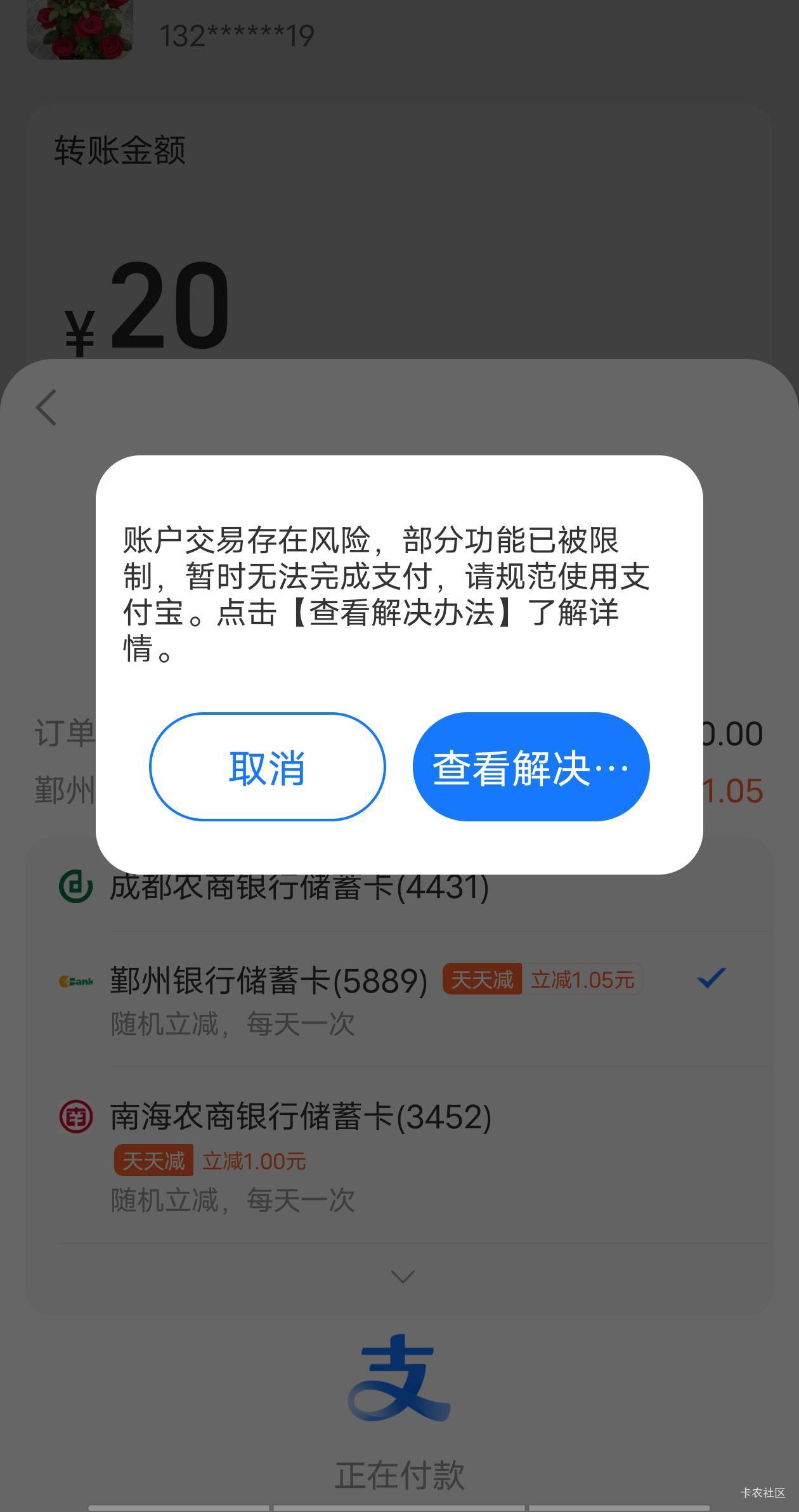 硫磺叔 发表于 2026-04-02 01:34 20也付不了?上次大额收款两个小号被限制了不过一天可以付最多1000,被整怕了,现在一律大号向小号收款,农信就4张卡都绑大号了,小号爱限制就限制,大号还要T xyk,不能被限制