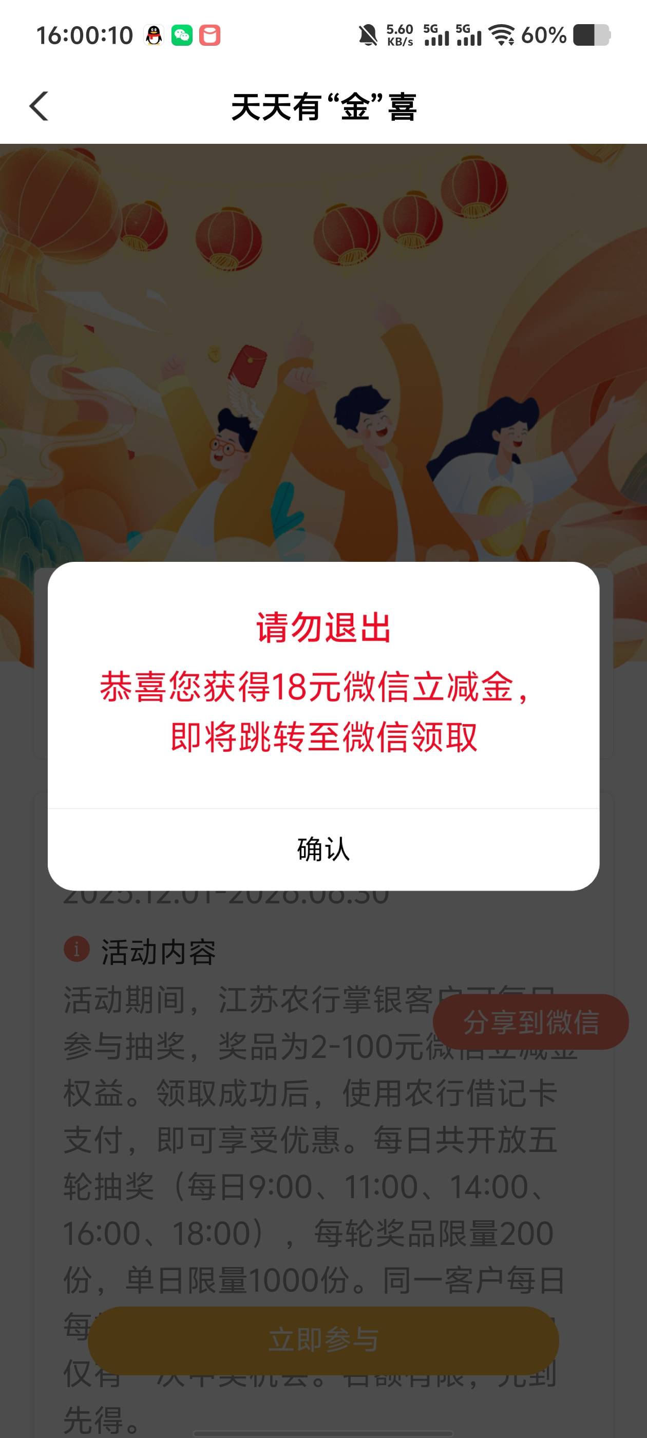 农行江苏掌银客户天天有金喜抽奖活动