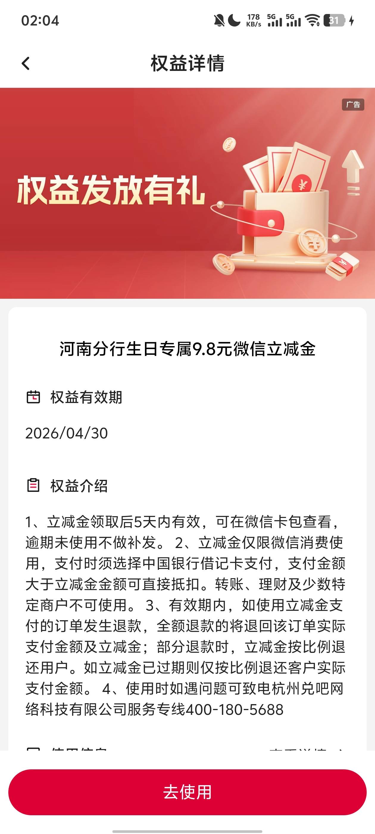 中行河南分行生日专属9.8元微信立减金活动