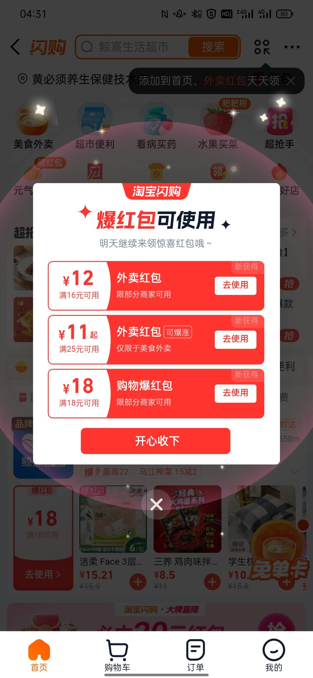 以前淘宝注销,上淘宝给劵,现在好像改了,支付宝进闪购。昨天跟今天都给劵了,又可以申请超市了
