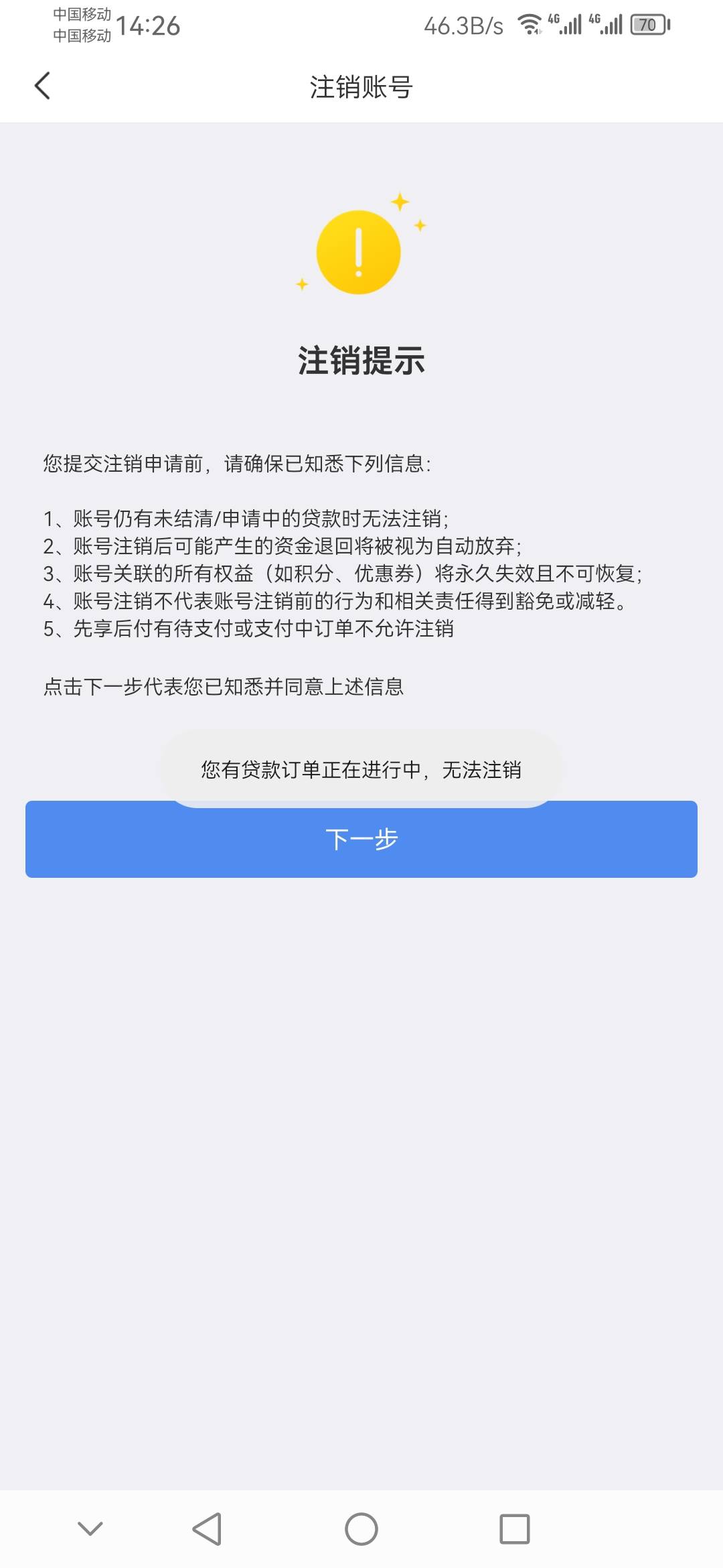 不一定……我没有,其实就是订单根本没取消,我去找在线客服说要注销,他才问我是否取消订单,大致意思是订单虽然取消了不放款也不会扣会员费但是后台还卡着这个单,要客服帮忙取消了在注销