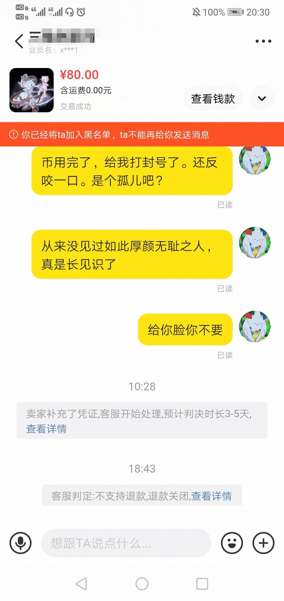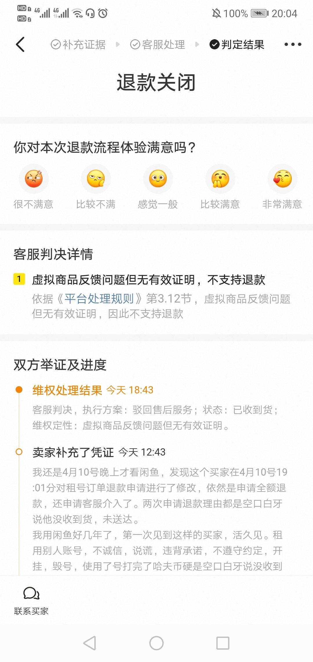 闲鱼客服还是给力的嘛,我还以为要等2-3天让买家提供证据,结果上午补充完证据,下午