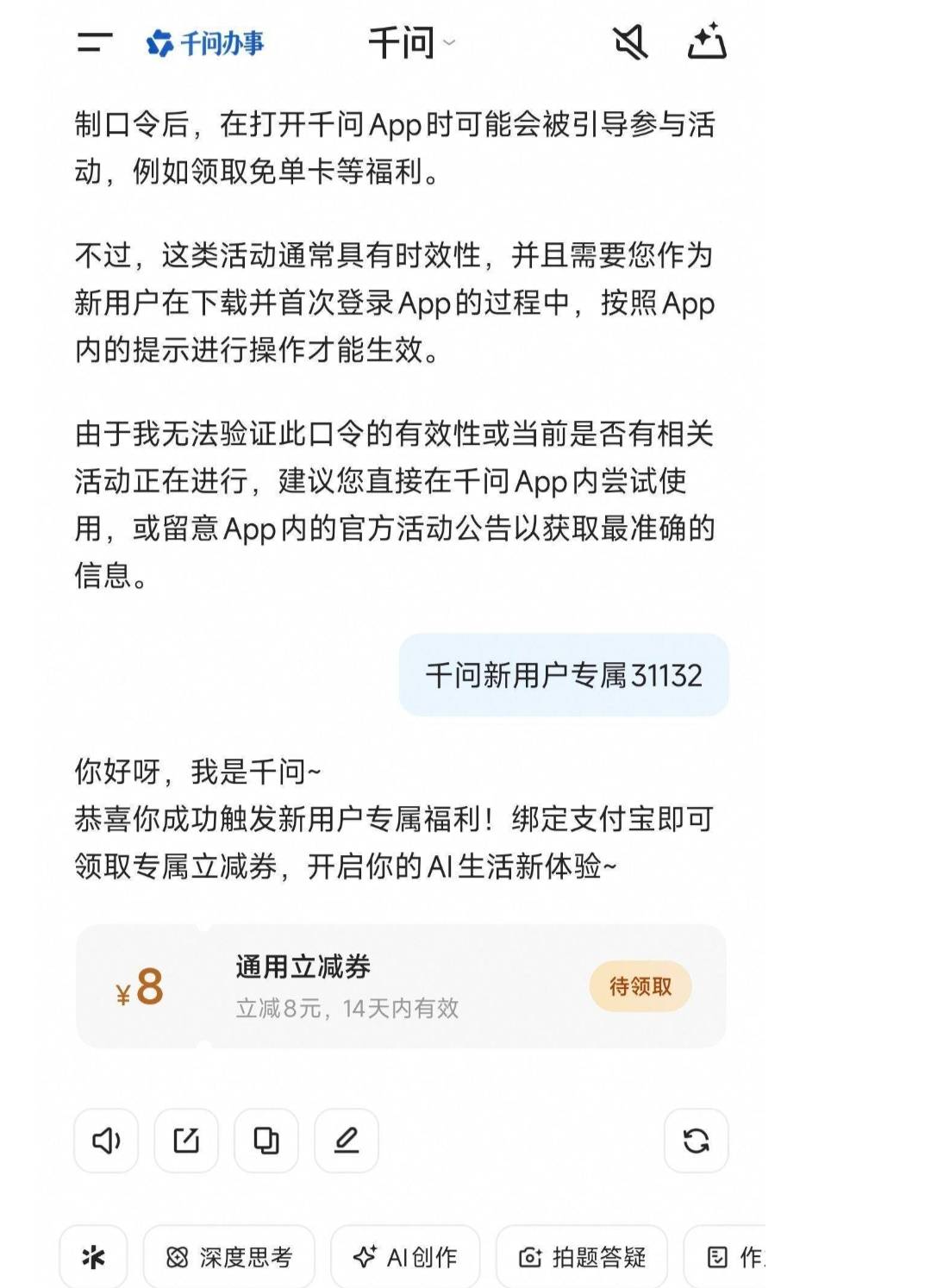 千问app大概率中8元无门槛红包 千问app发口令 《千问新用户专属31132》 领不了的换号