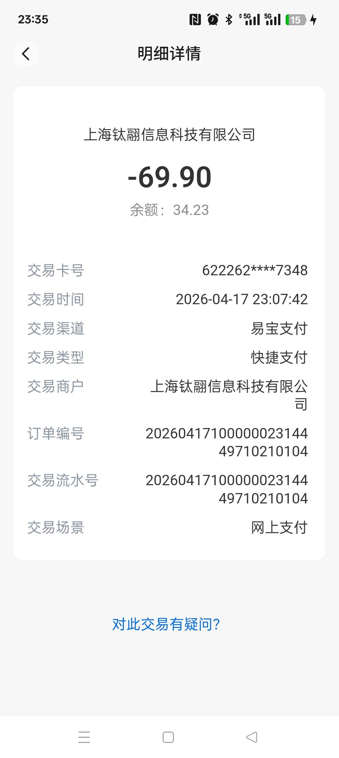 王掌柜 发表于 2026-04-17 23:44 你应该是乱点哪个平台了。你这是YHK的账单。正常来讲扣完都会发信息通知你。是不是被你拦截了。你去看看骚扰拦截里面有没有信息。一般都会附带电话,