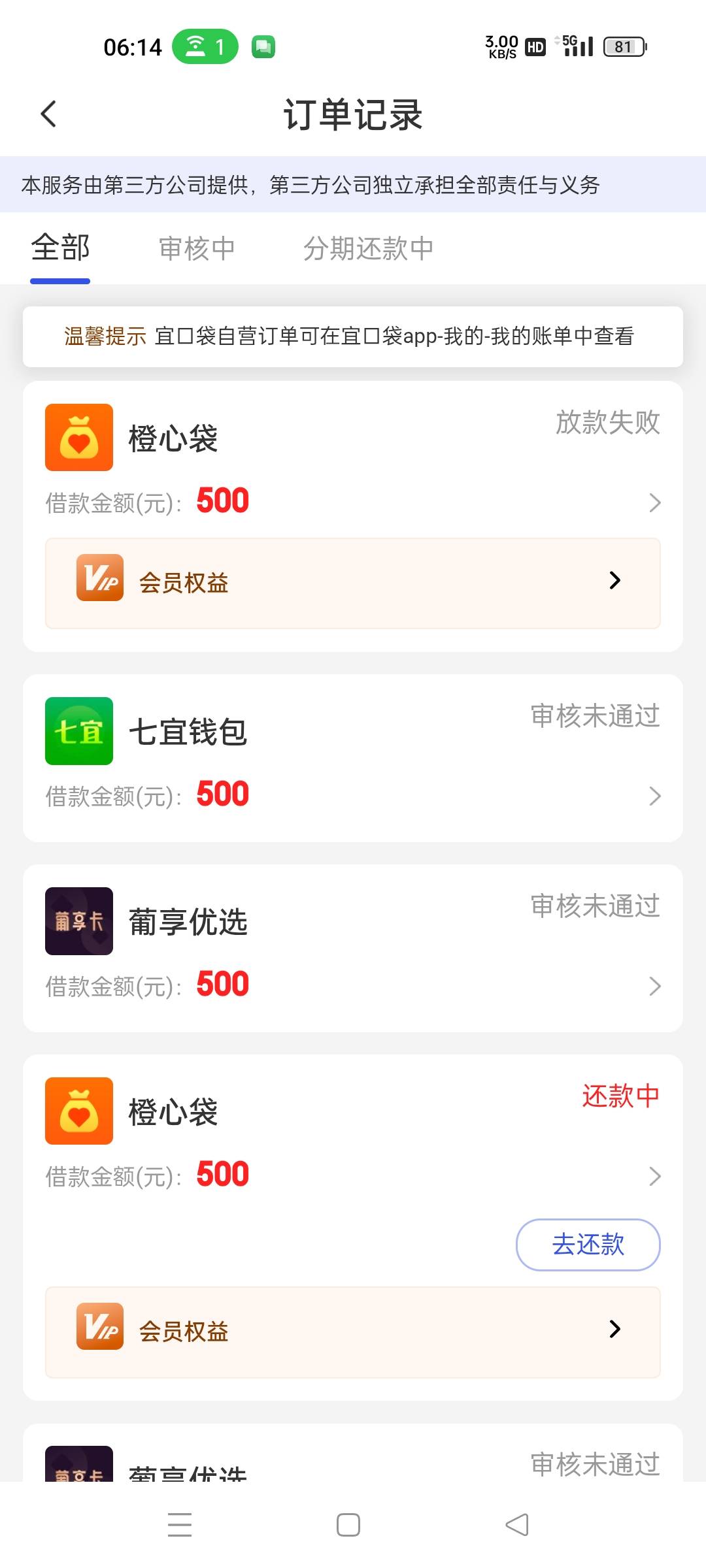 橙心贷逾期第三天放款失败 看来不给放了