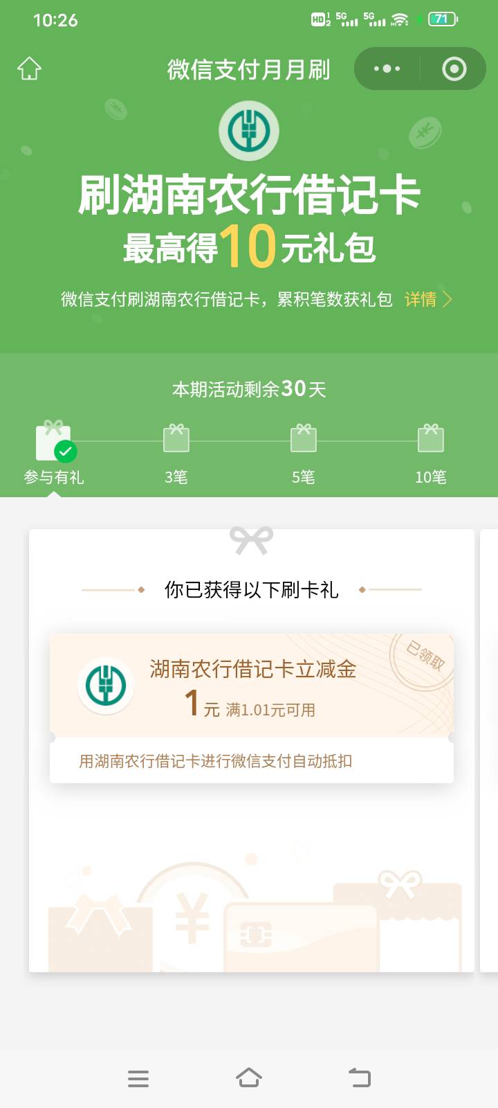 农行湖南微信支付月月刷活动