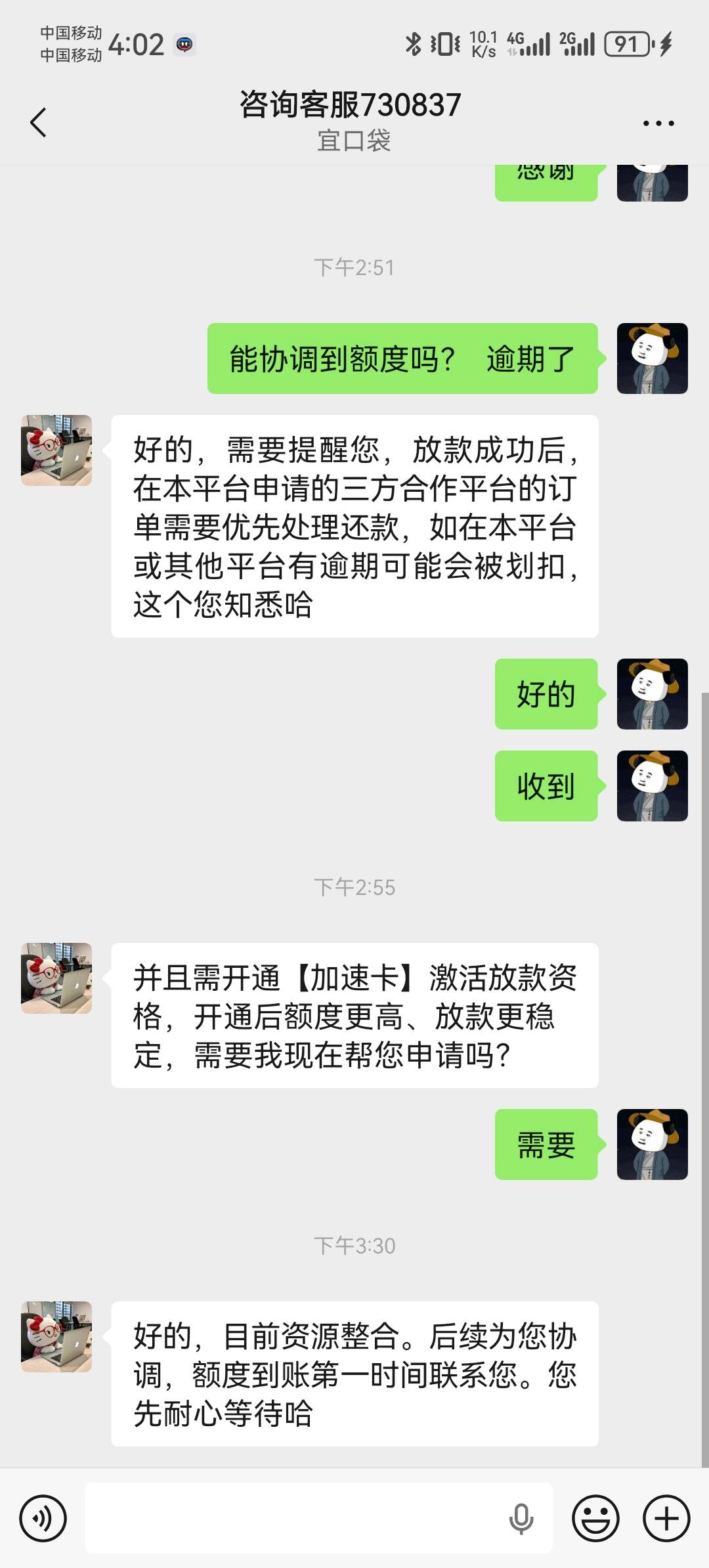 你妹吃鸡 发表于 2026-04-21 15:57 上次协调完,这次又逾期两天了连个电话都没有,联系咨询客服不搭理我