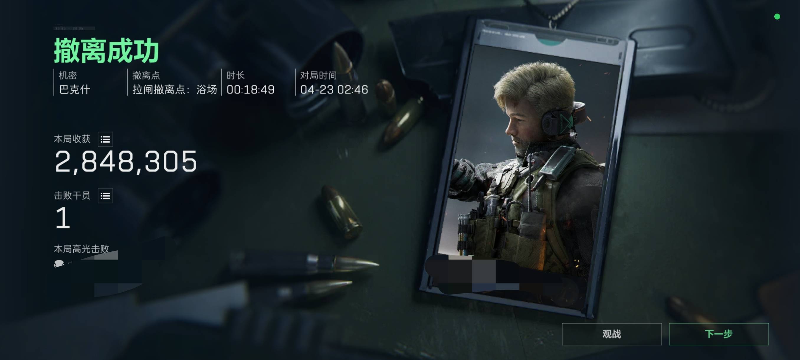老哥们,笑死我了。刚玩了一把巴克什做任务,搜了几十万拉了闸在浴场撤离点的皮卡车里面趴着。最后一分钟我都摘掉耳机,等着撤离了。突然听到有爆炸声音,站起来一看旁边有个被自己虎蹲炸到的威龙,赶紧把他打了,他没队友直接灭队。最后几十秒舔了他的包吃了快三百万。