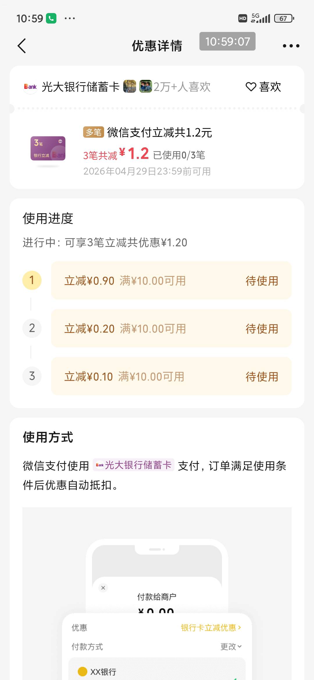 微信摇一摇光大银行微信支付多笔立减活动