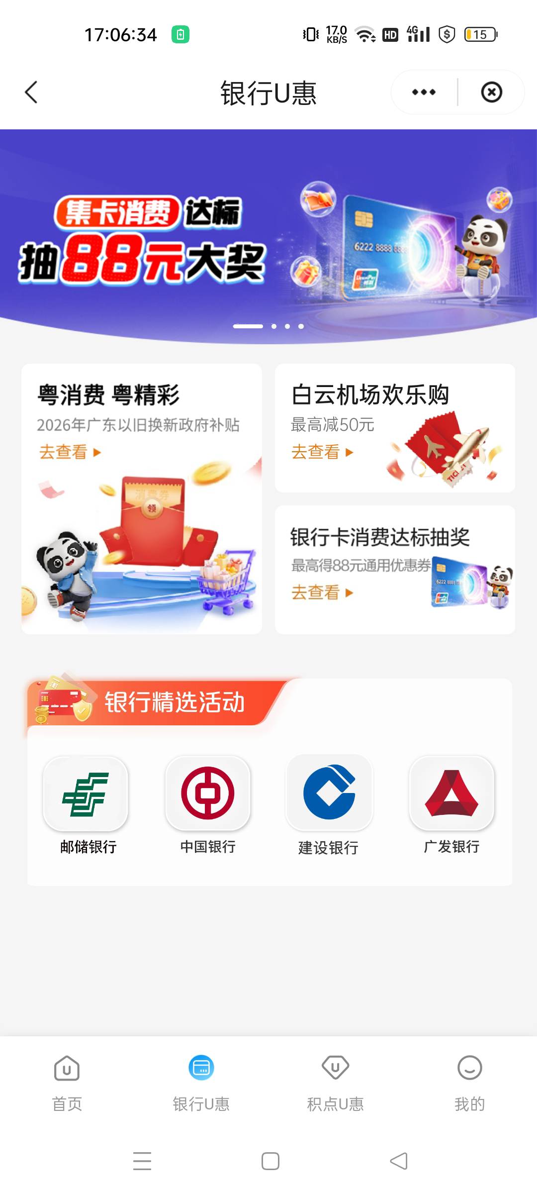 广东云闪付,集卡消费达标抽88元大奖。活动入口,u惠广东→银行u惠→顶部横幅,进去先