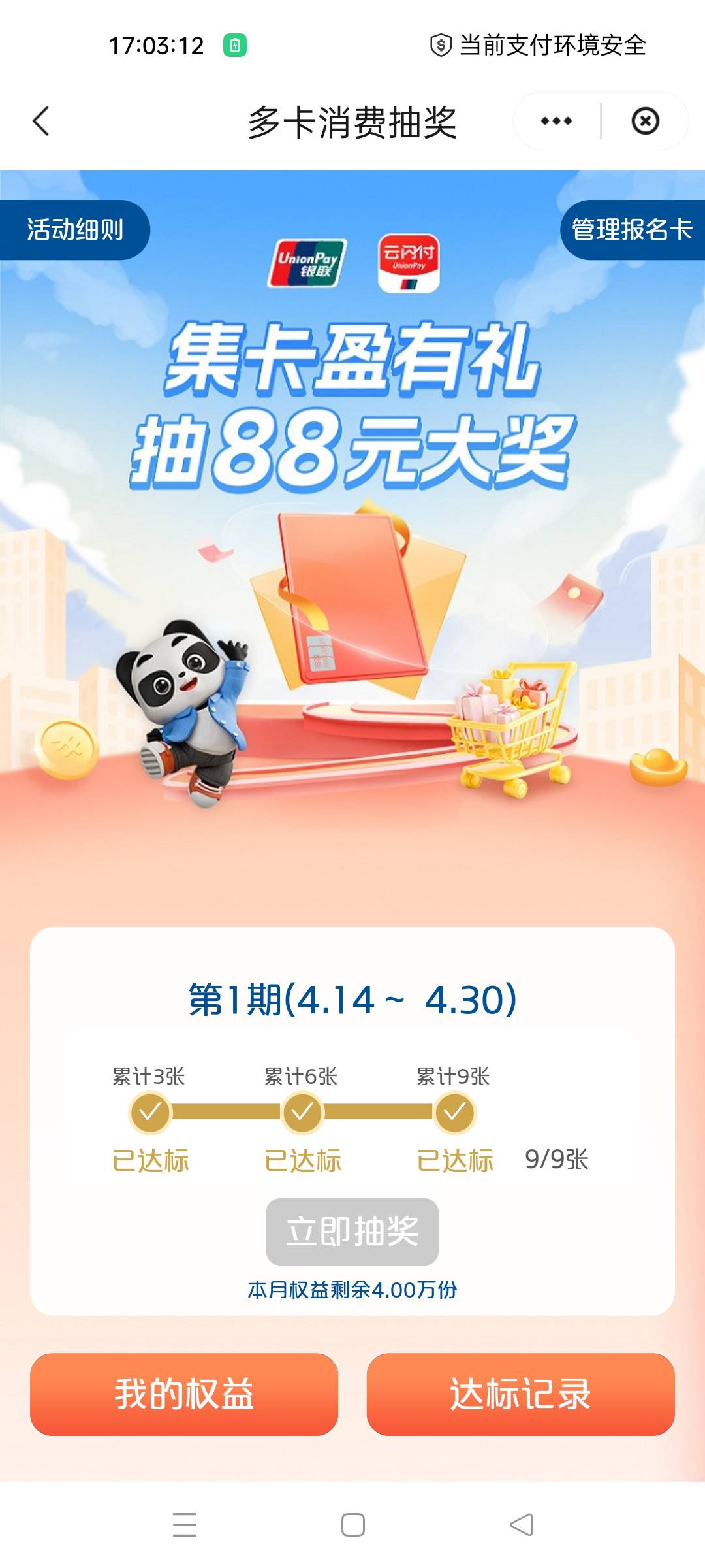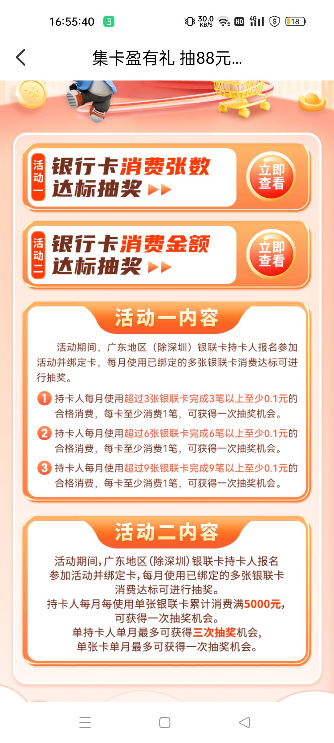 广东云闪付,集卡消费达标抽88元大奖。活动入口,u惠广东→银行u惠→顶部横幅,进去先多张卡打勾报名。。活动一,九张报名卡云网消费0.1,小程序密码红包,塞0.25以下免手续费,可以塞0.3消耗玩赚生活给的0.15,支付的时候微信支付往下拉就能看到云网支付,活动二,九张报名卡云网消费5000,跟之前有礼乐开花充三次多方平台app钱包62一样,只不过这次是总消费5000。。活动一抽奖0.8/1.8/4.8/8.8/88,活动二抽奖1.8/8.8/88