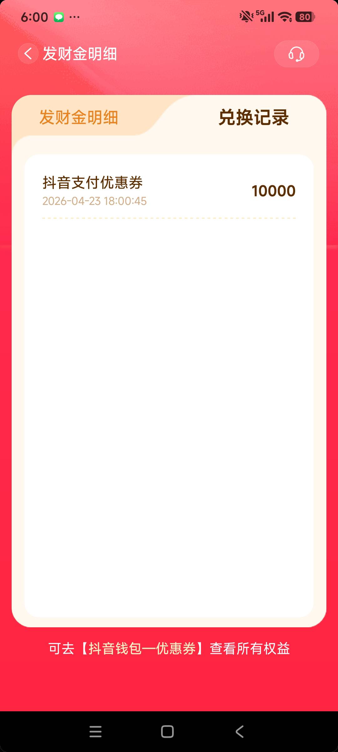 抖音发财金签到领10000积分换1元消费金,买个e卡