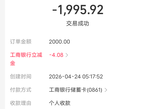 工行支付2000随机减又有了,三笔12毛到手