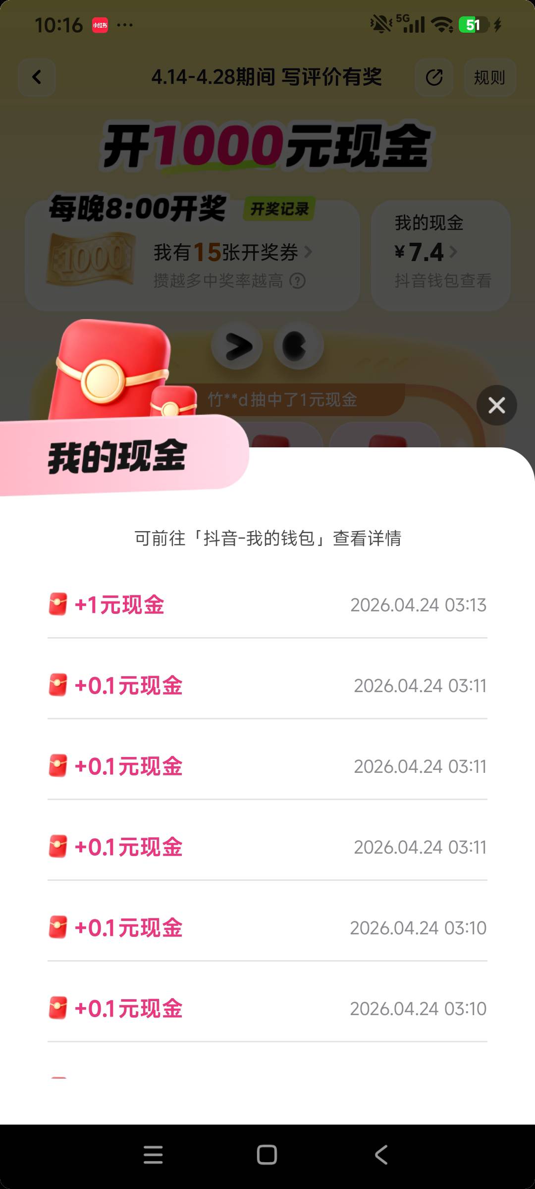 抖音写评价有奖开1000元现金活动