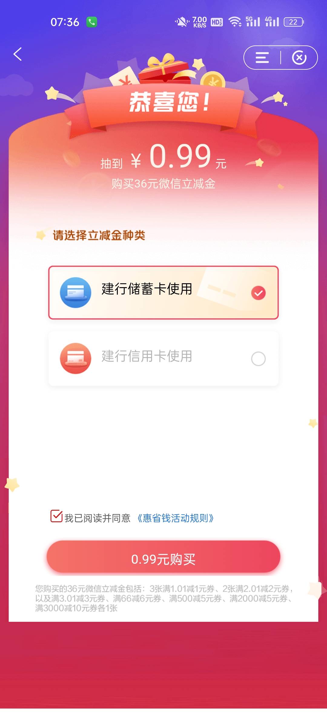建行惠省钱超值36元立减金活动