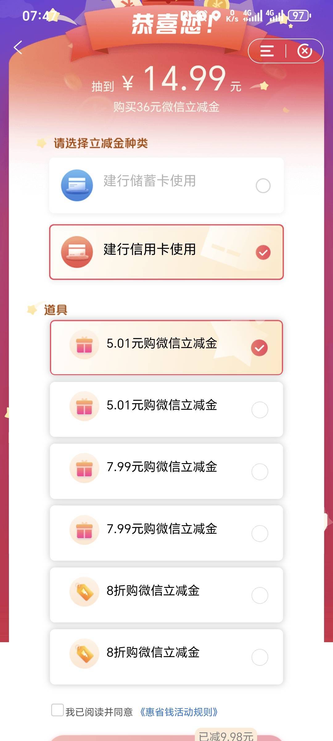 建行省钱卡几个道具都要花5块钱