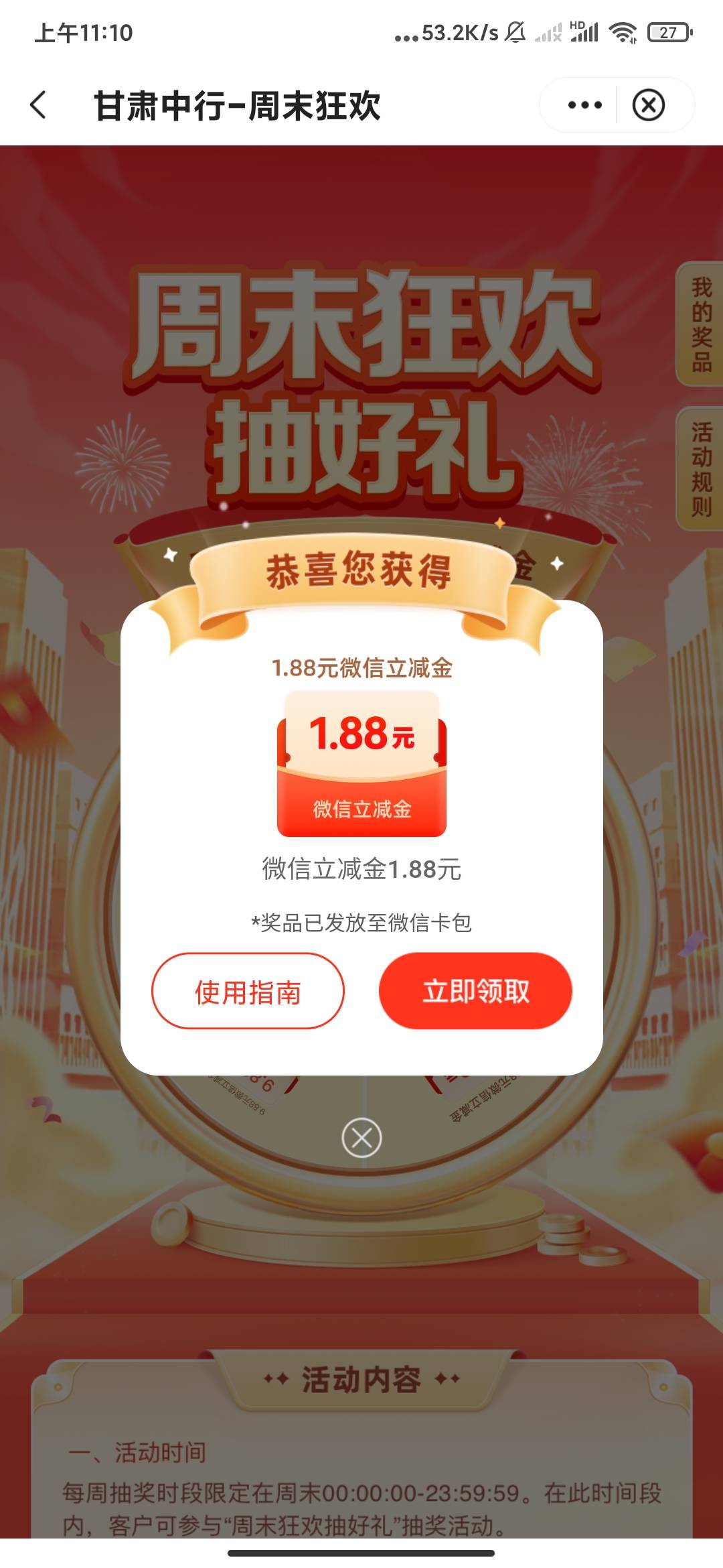 中行甘肃周末狂欢1分钱抽好礼活动
