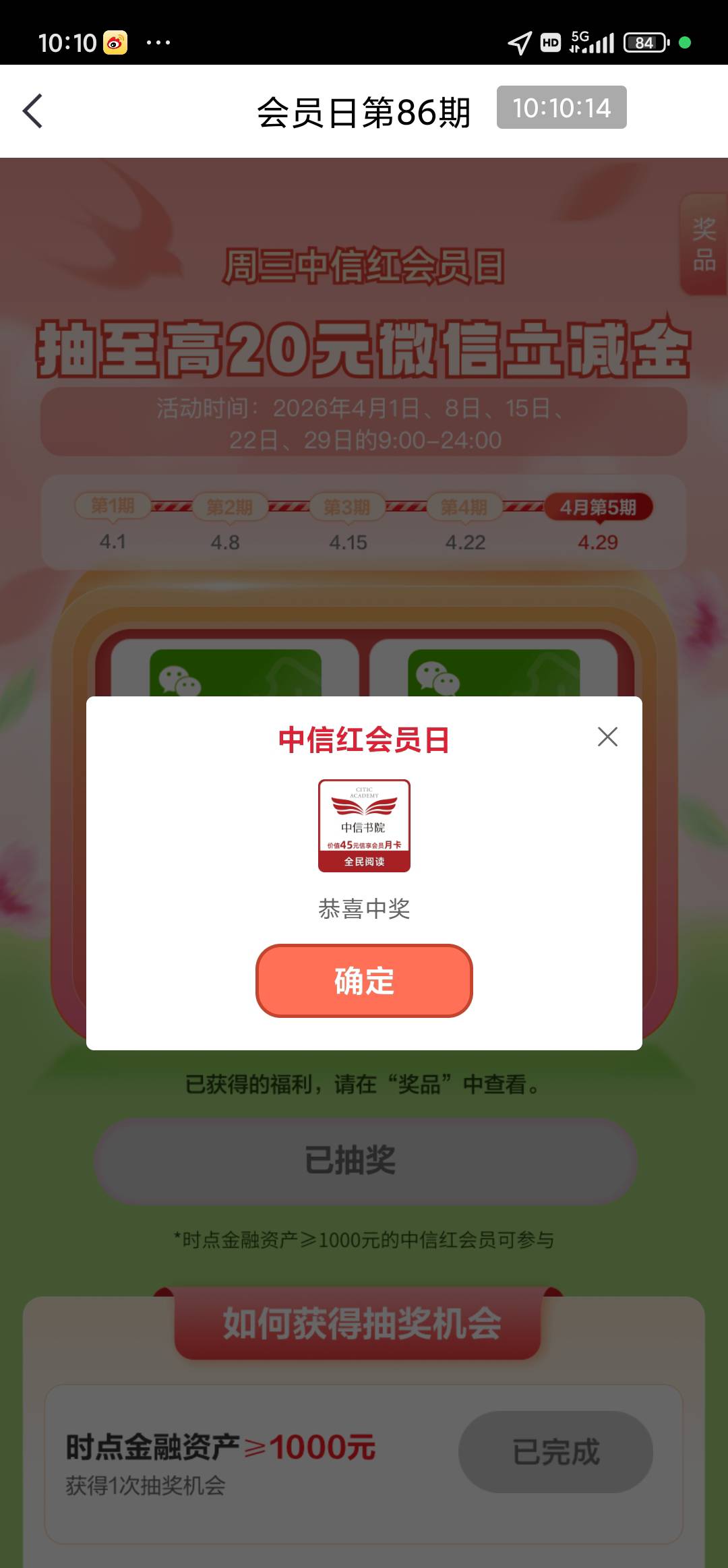中信银行周三红会员日抽微信立减金活动