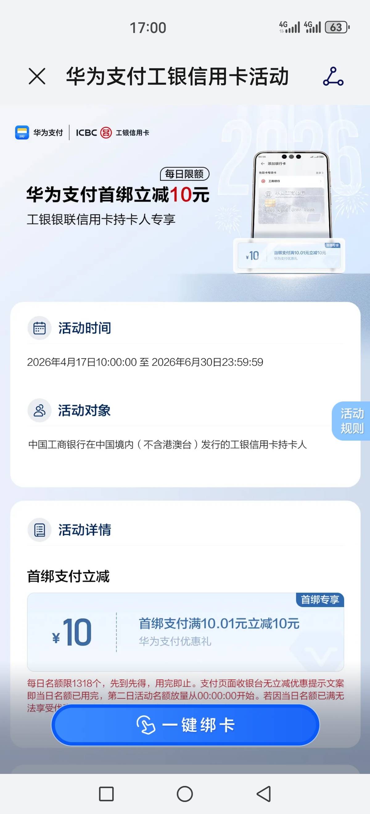 工银银联信用卡华为支付首绑立减10元活动