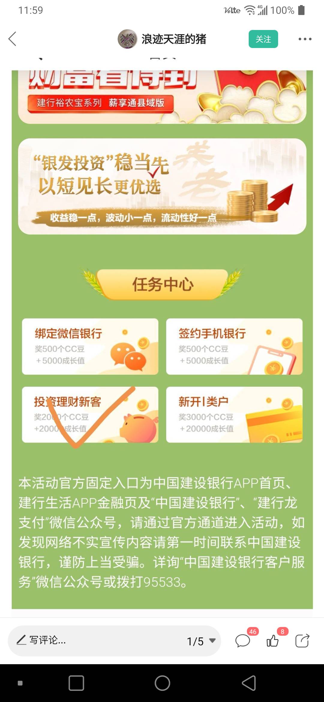 入口建设银行app_首页_优惠专区奋斗季_精彩专区裕农专区_任务中心投资理财新客,点击先报名,报名后去买一块理财或基金就行。
