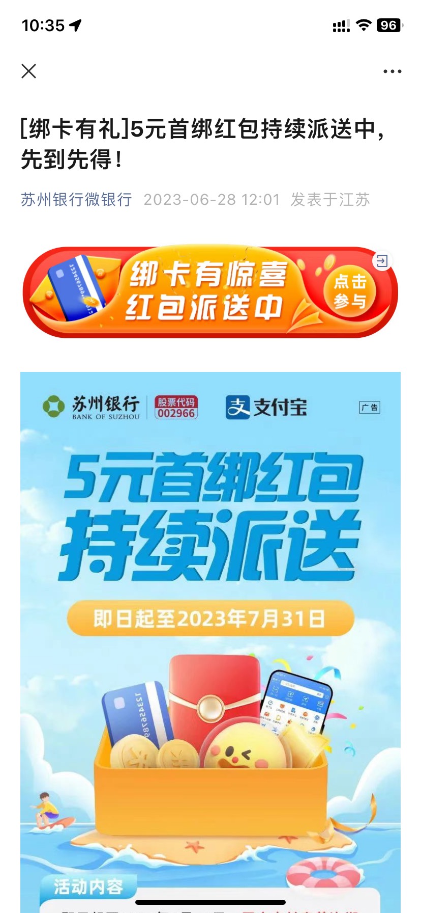 首发 苏州银行工众号 绑定支付宝给5毛