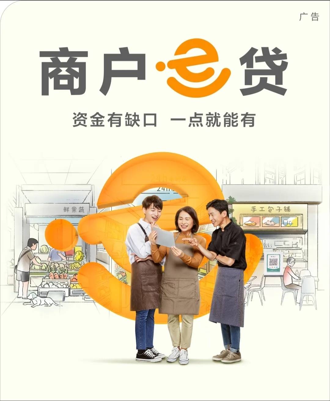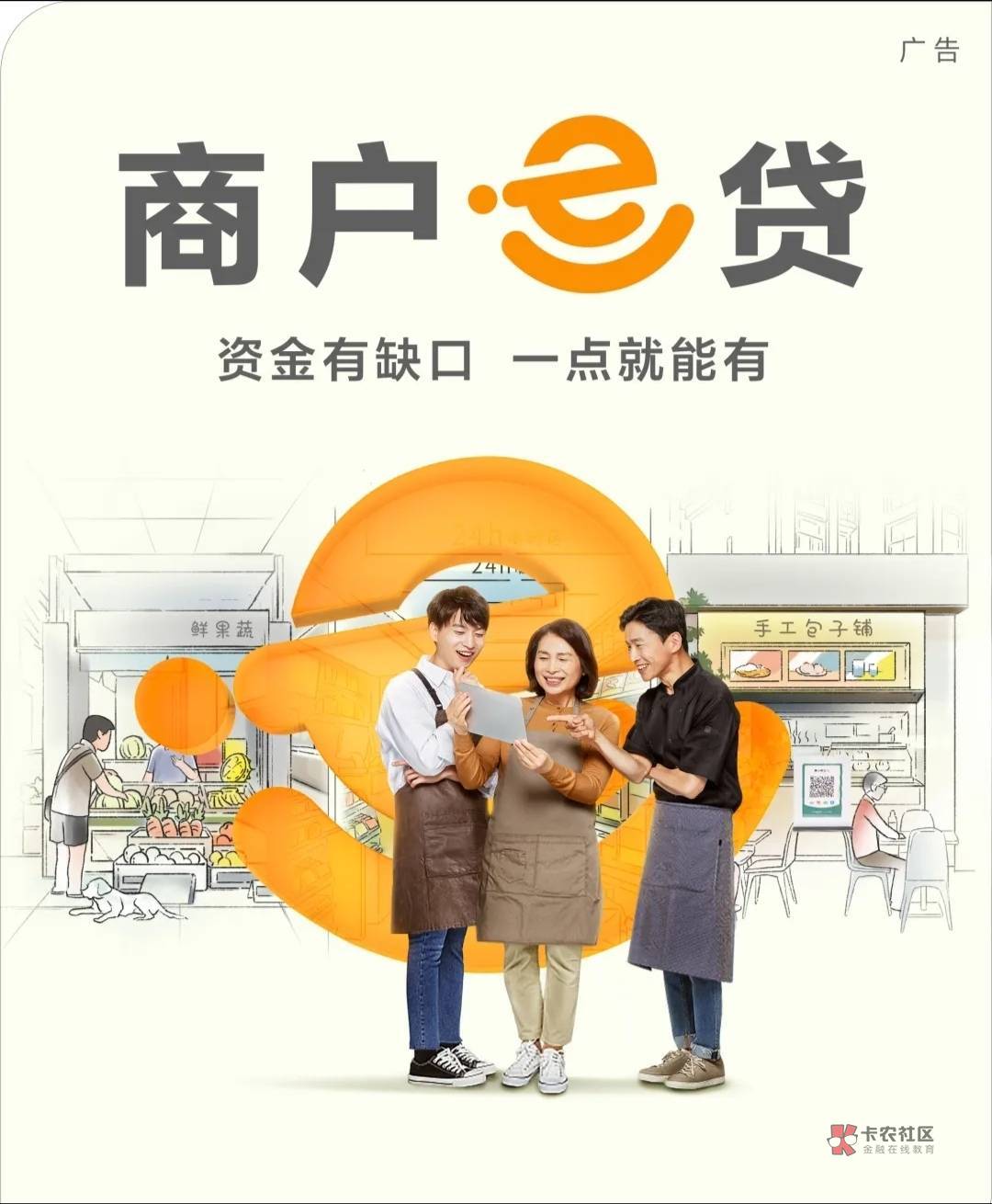 1、商户e贷是农业银行针对市场商圈内的从事经营的个体商户新市民群体发放的线上个人经营贷款,满足其支付租金,备货等资金需求。
