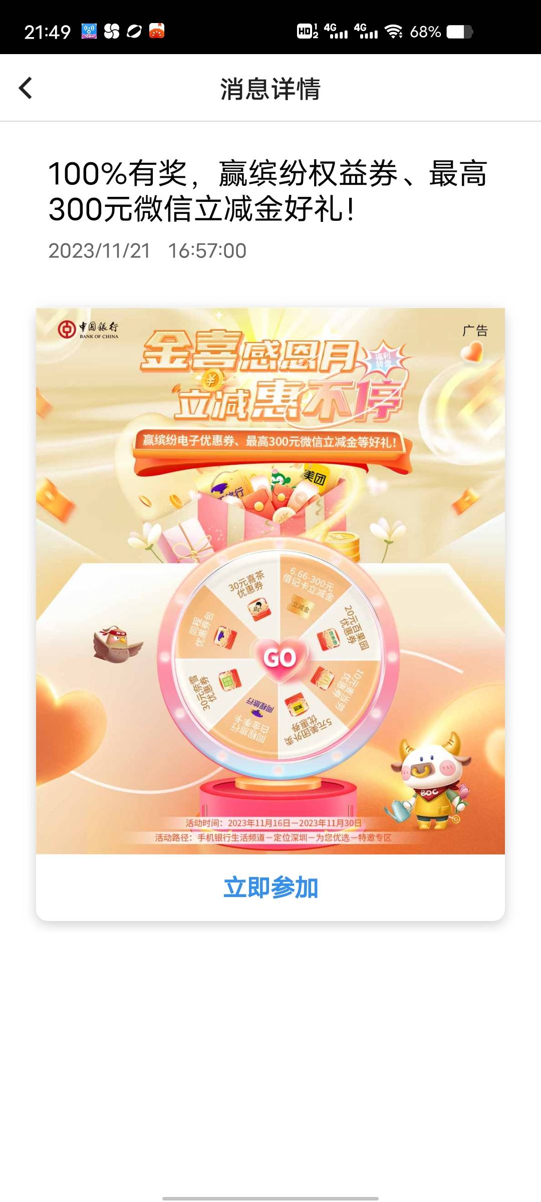 中行深圳特邀专区,金喜感恩月立减惠不停福利转盘