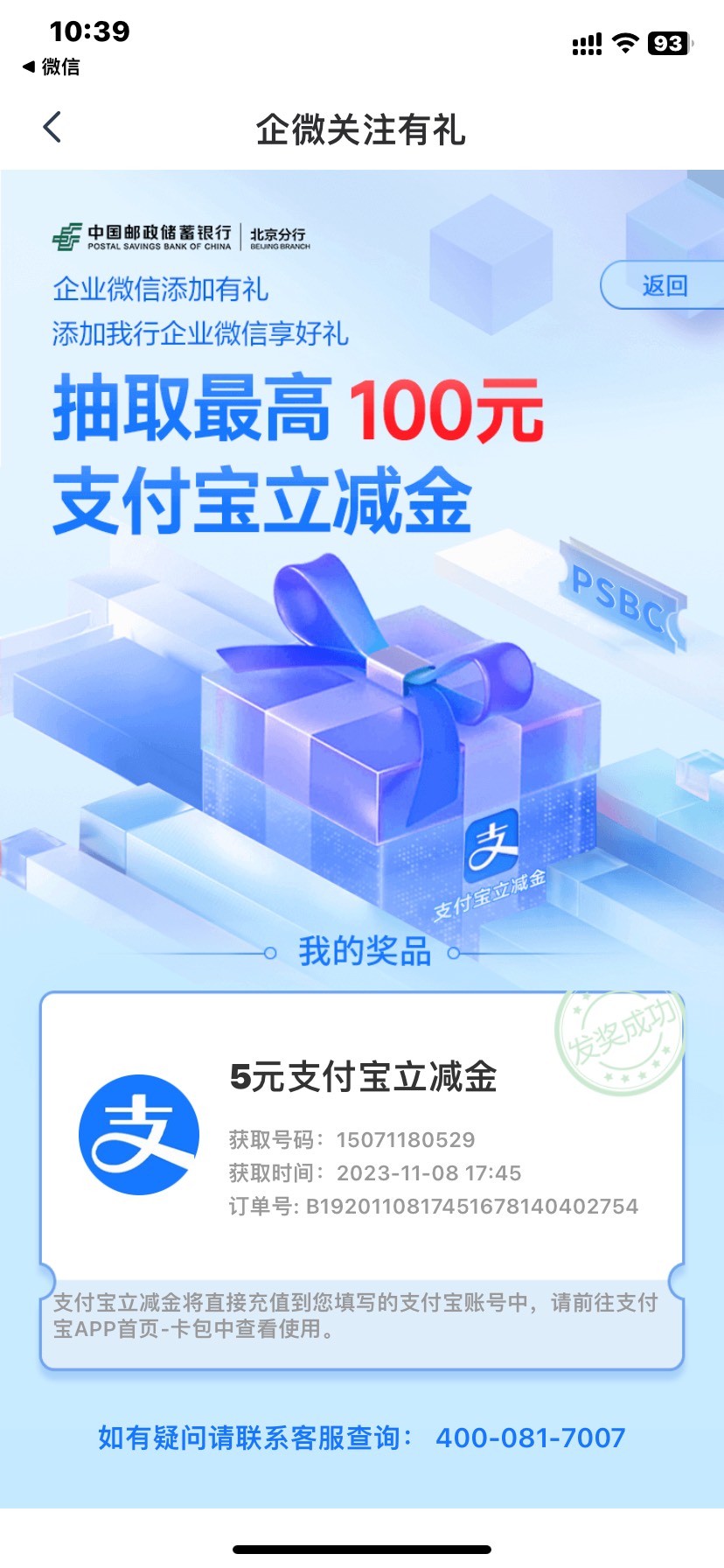 邮储北京企微添加有礼,抽取支付宝立减金