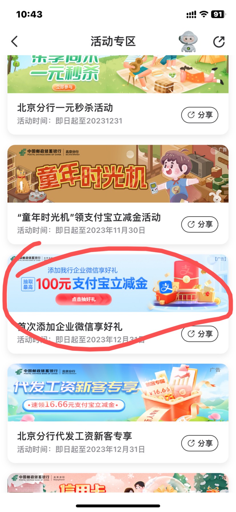 邮储北京 添加企业微信领好礼 最高100